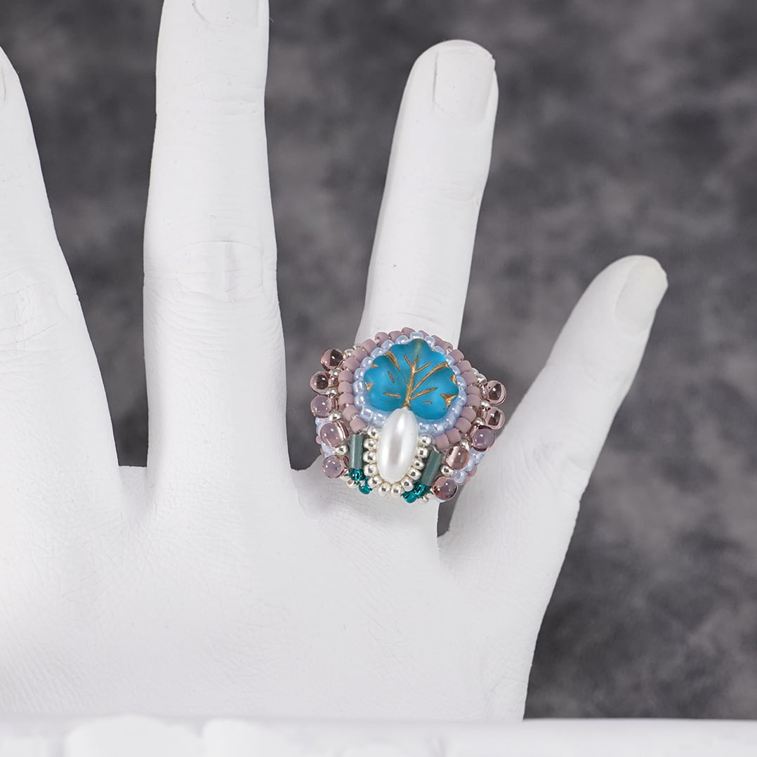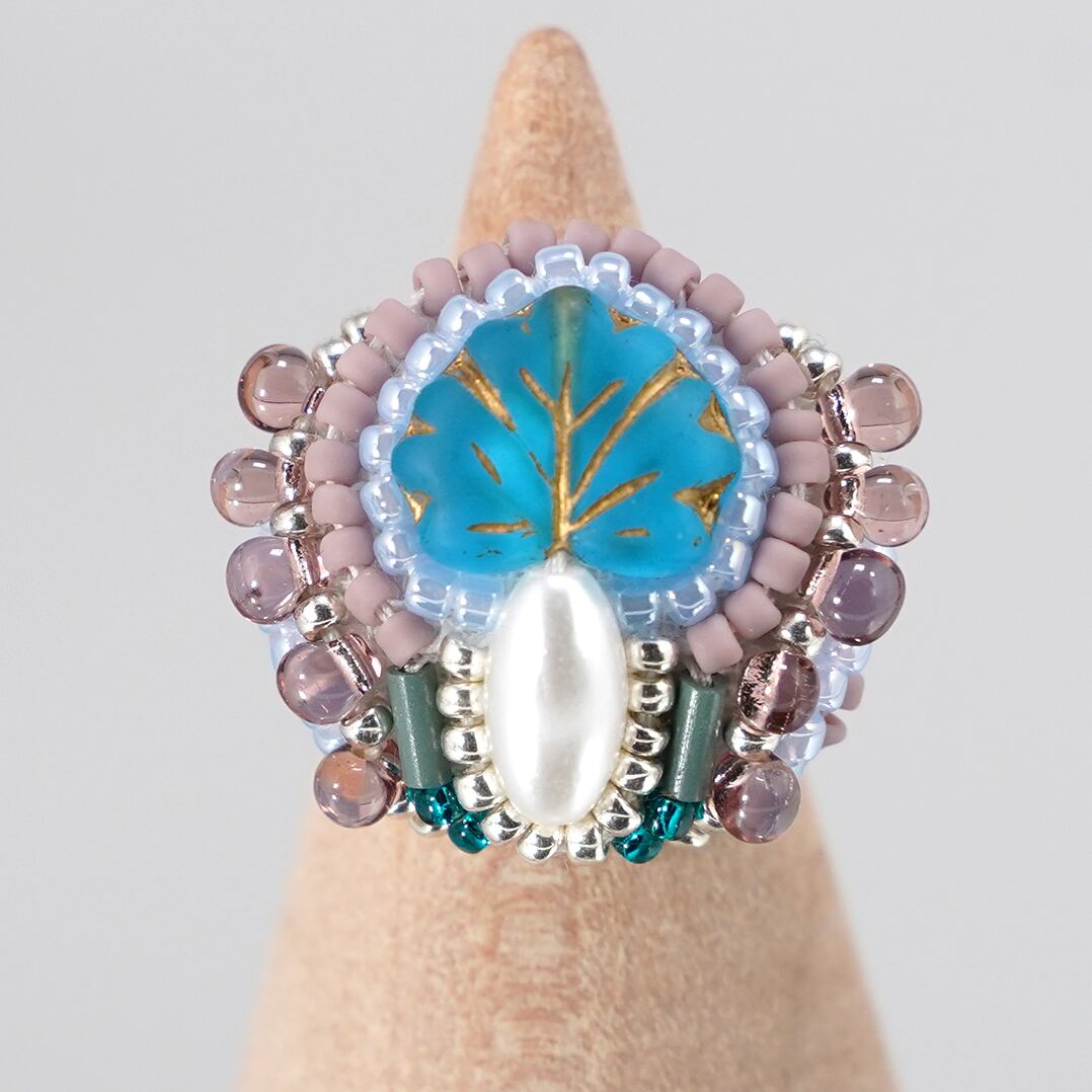 スカーフ留めにも おしゃべりな指輪187 フリーサイズ ビーズ刺繍のリング ブルー おおぶりリング
