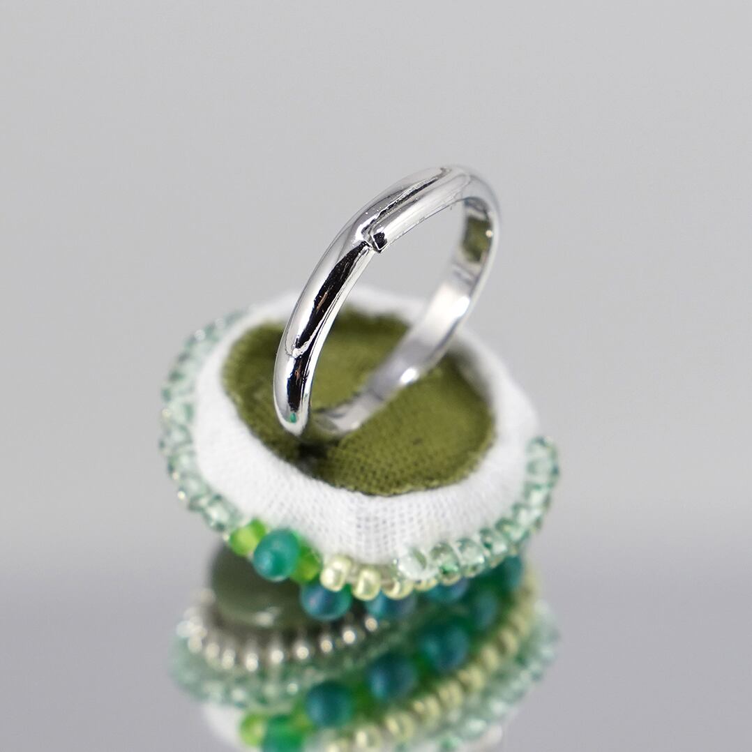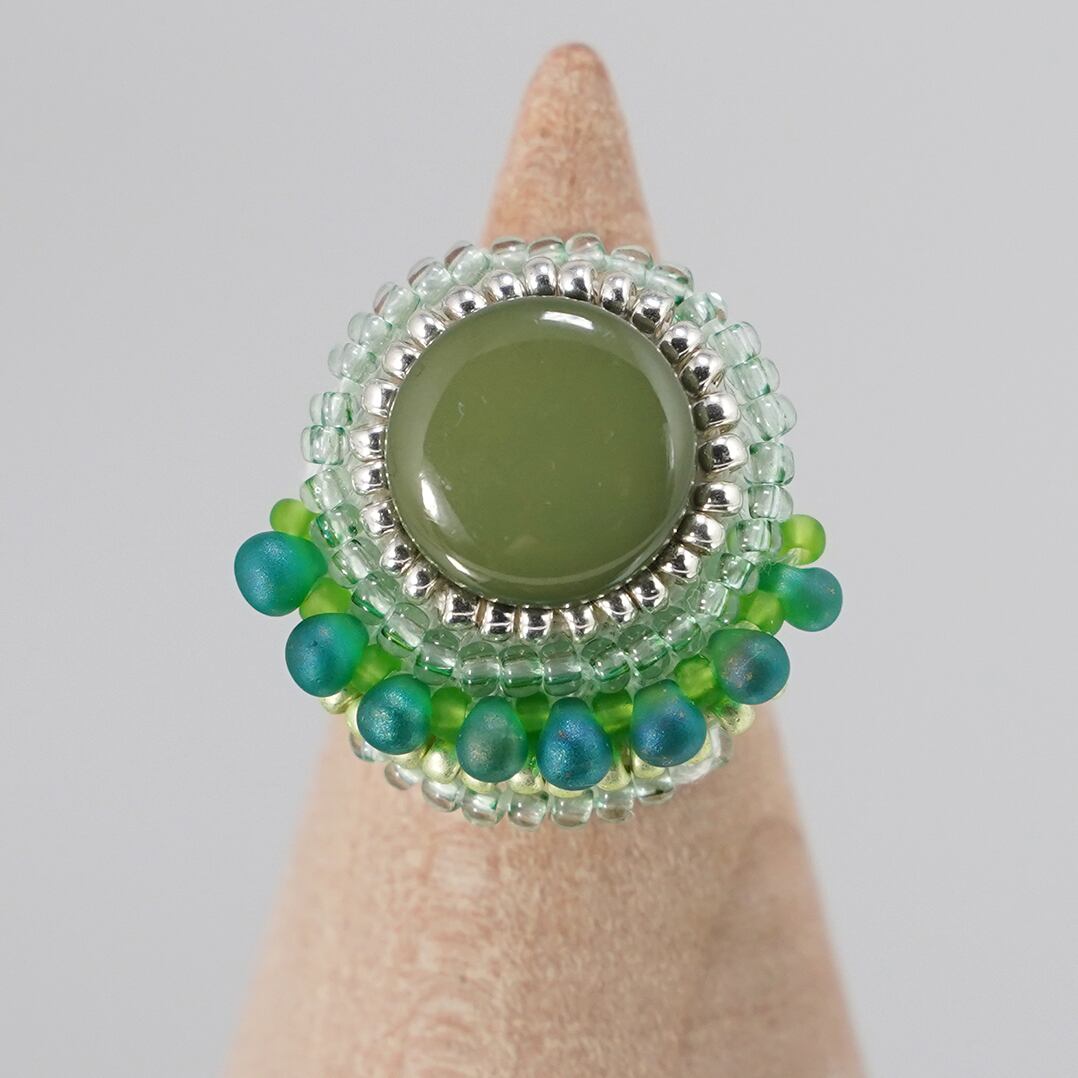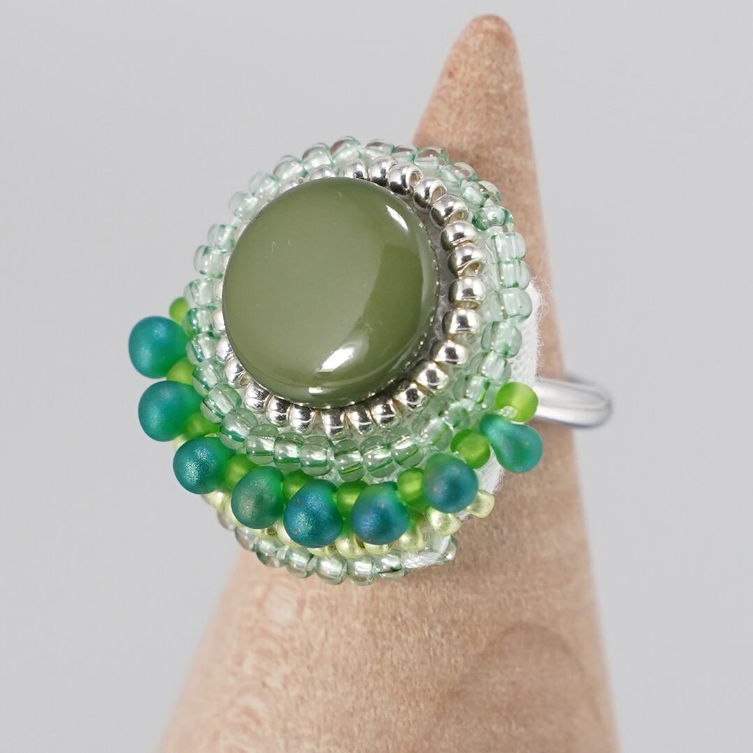 スカーフ留めにも おしゃべりな指輪190 フリーサイズ ビーズ刺繍のリング グリーン おおぶりリング