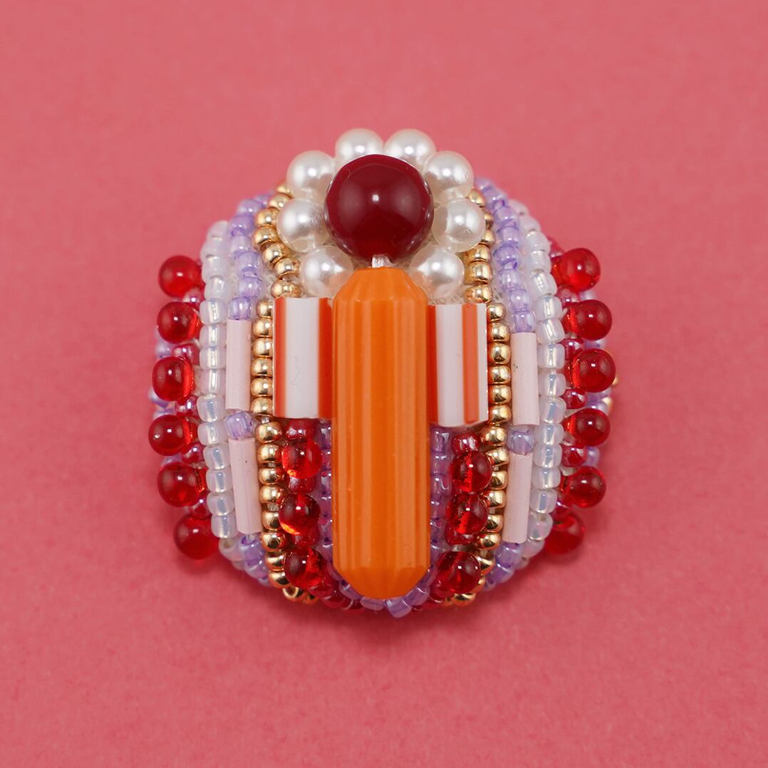 そのビーズを引き立てるように隙間なく刺繍をすると、カラフルでにぎやかで、まるでおしゃべりをしているように仕上がります。
