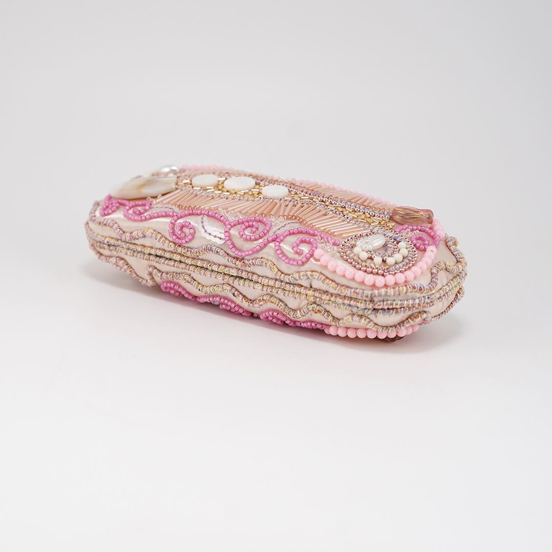 両面にびっしりと施されたビーズ刺繍は、ガーゼ生地にキルト芯を貼り、糸とビーズで繊細に描いたもの。 手に取るたび、刺繍の密度と立体感に心がときめきます。