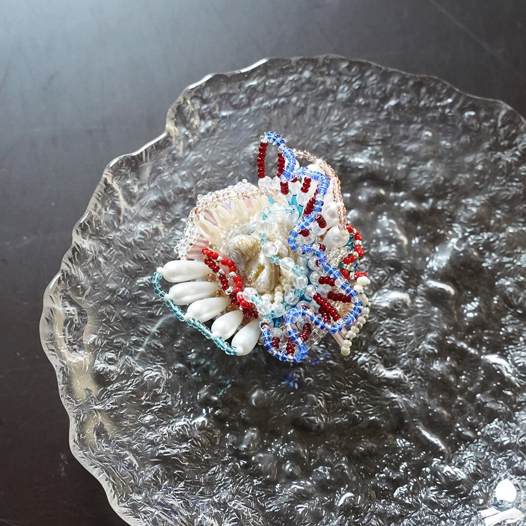 貝ビーズを中心にシードビーズでフリルを描くように刺繍しています、ビーズをふんだんに使用した立体感のある仕上がりになっています。
