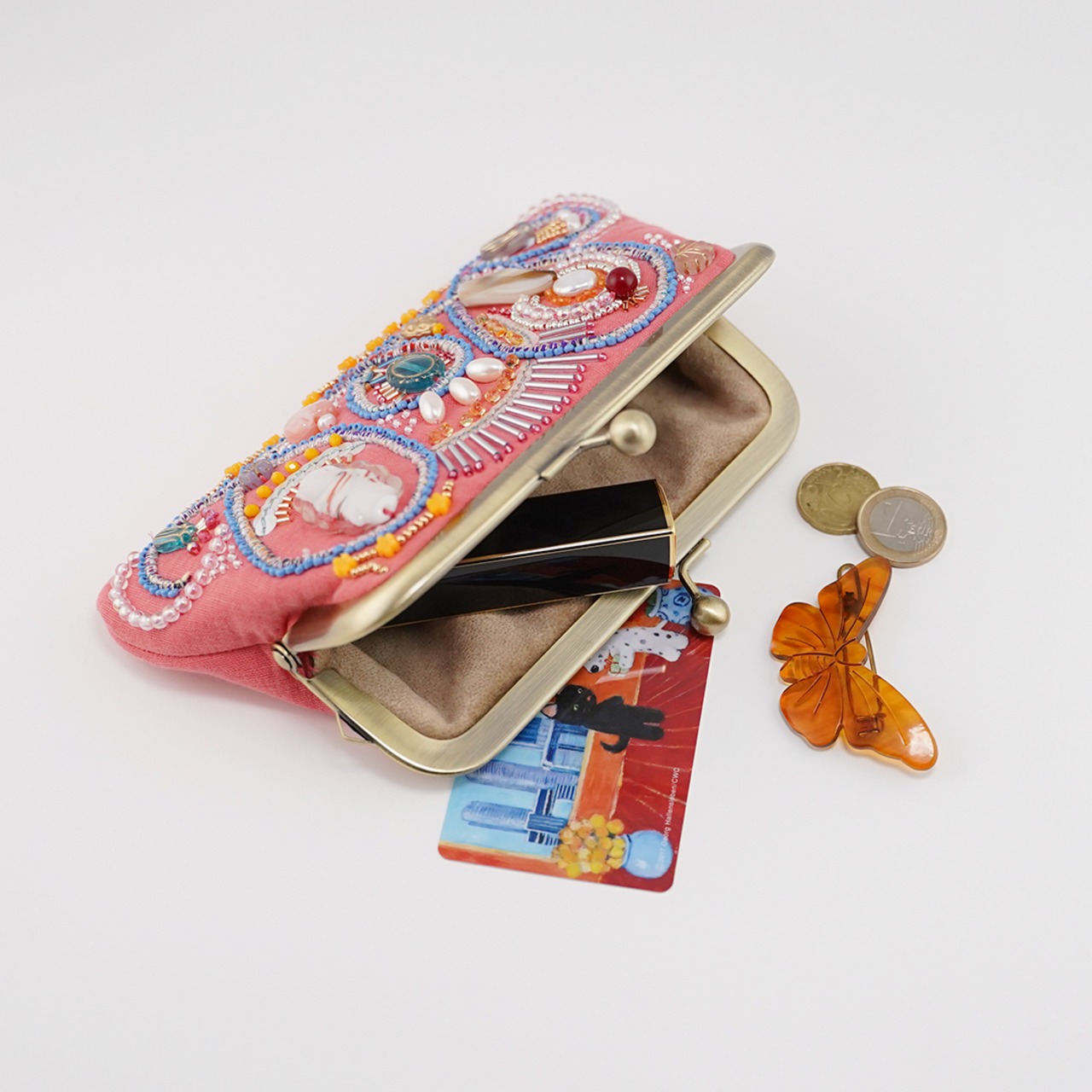 ビーズ刺繍のがま口 No.4|コーラルピンク|ガーゼ素材|マチなしポーチ|カード収納可|手刺繍|一点もの|ギフトに