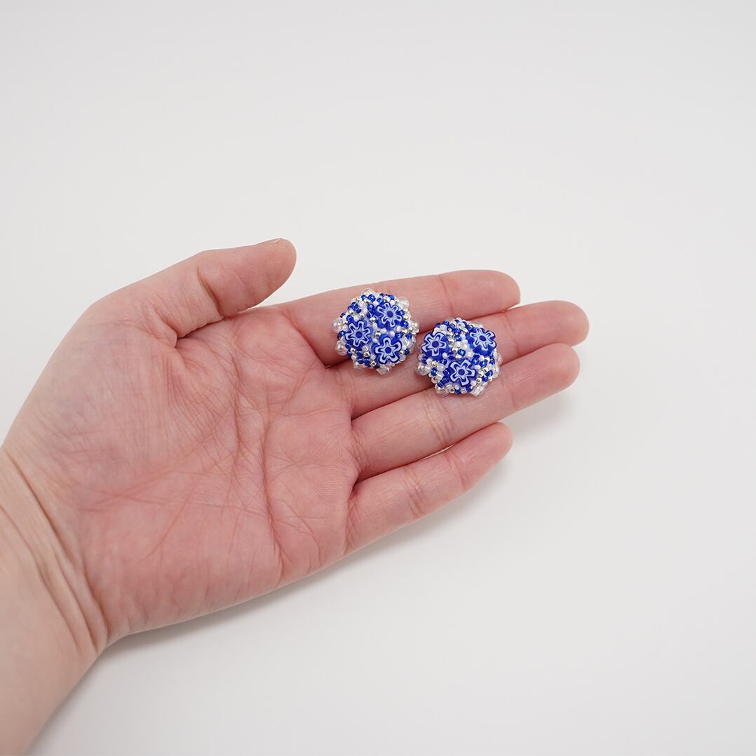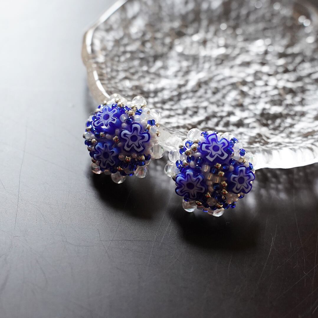 キッチン4 イヤリング ピアス ビーズ刺繍 ブルー ホワイト シルバー おおぶり