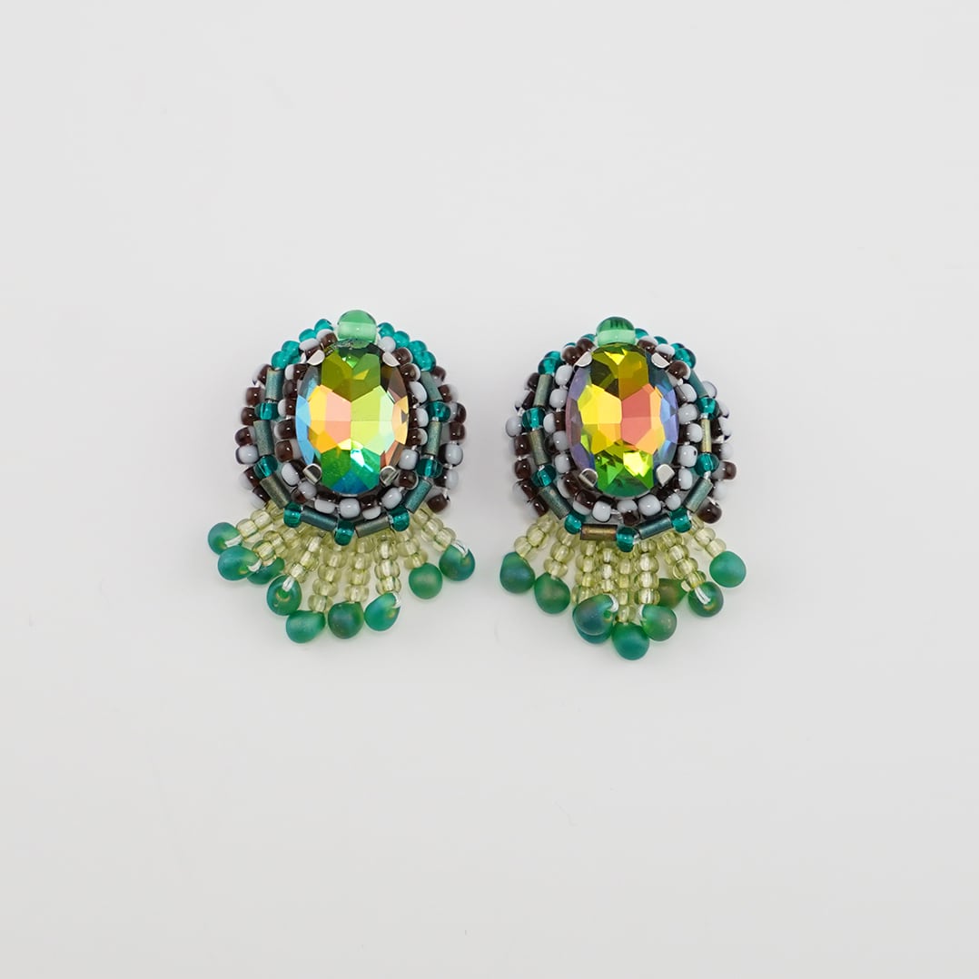 ビーズ刺繍のイヤリング ピアス 16 グリーン ブラック ホワイト ビジュー おおぶり 一点もの 個性的 フリンジ