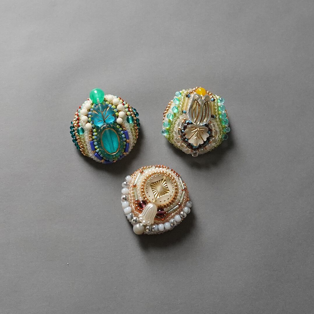 そのビーズを引き立てるように隙間なく刺繍をすると、カラフルでにぎやかで、まるでおしゃべりをしているように仕上がります。