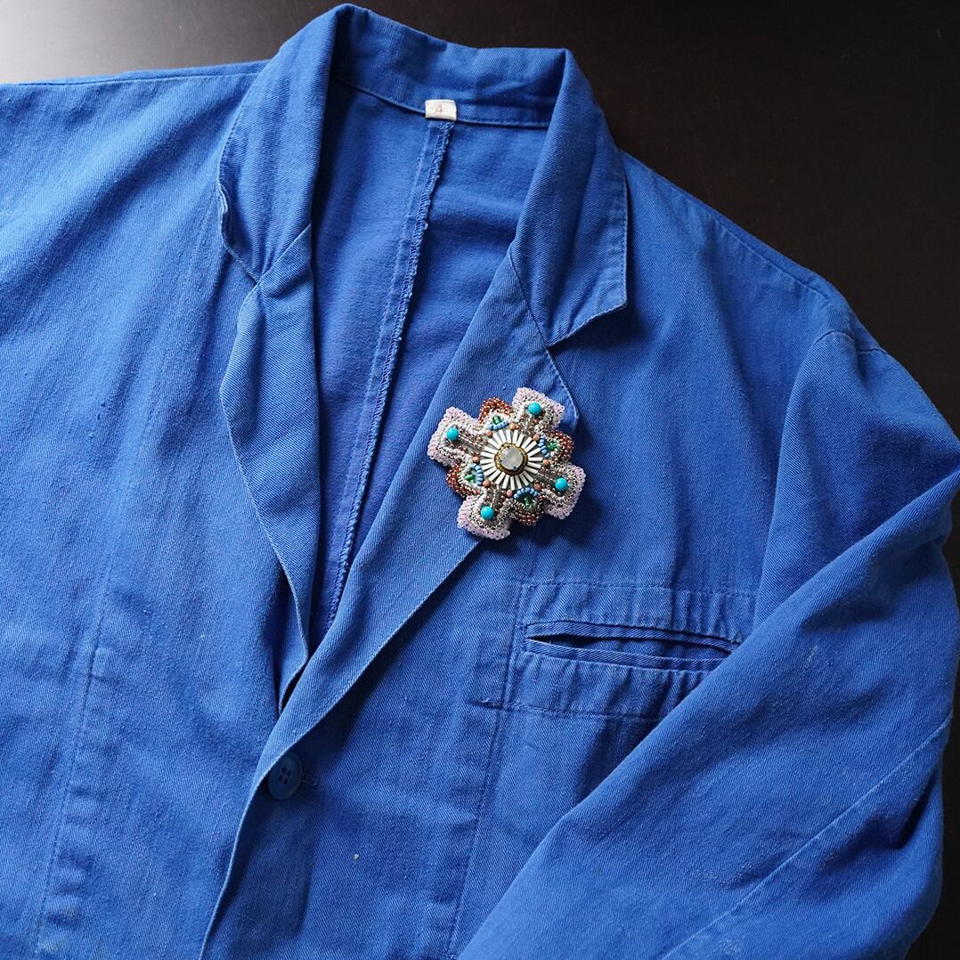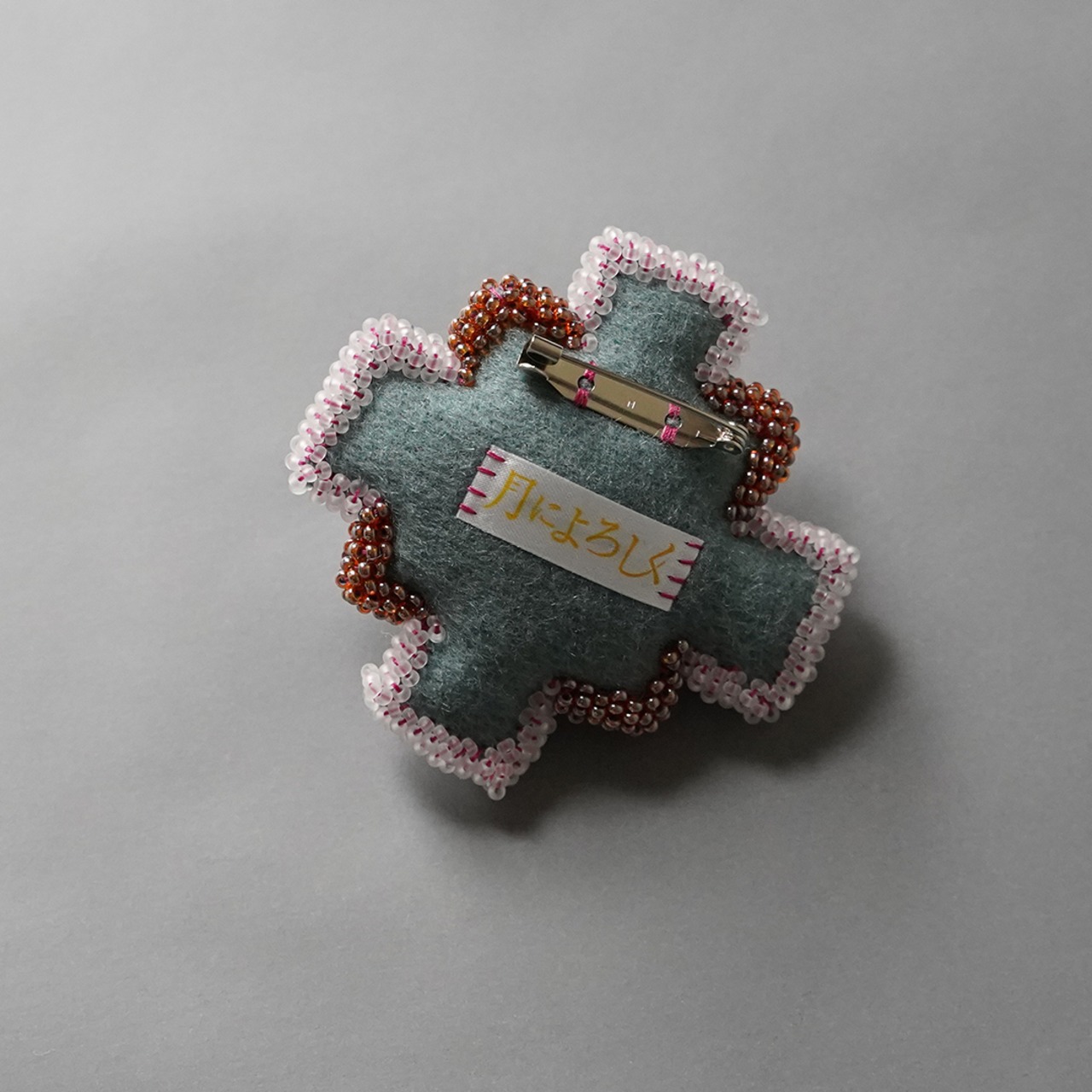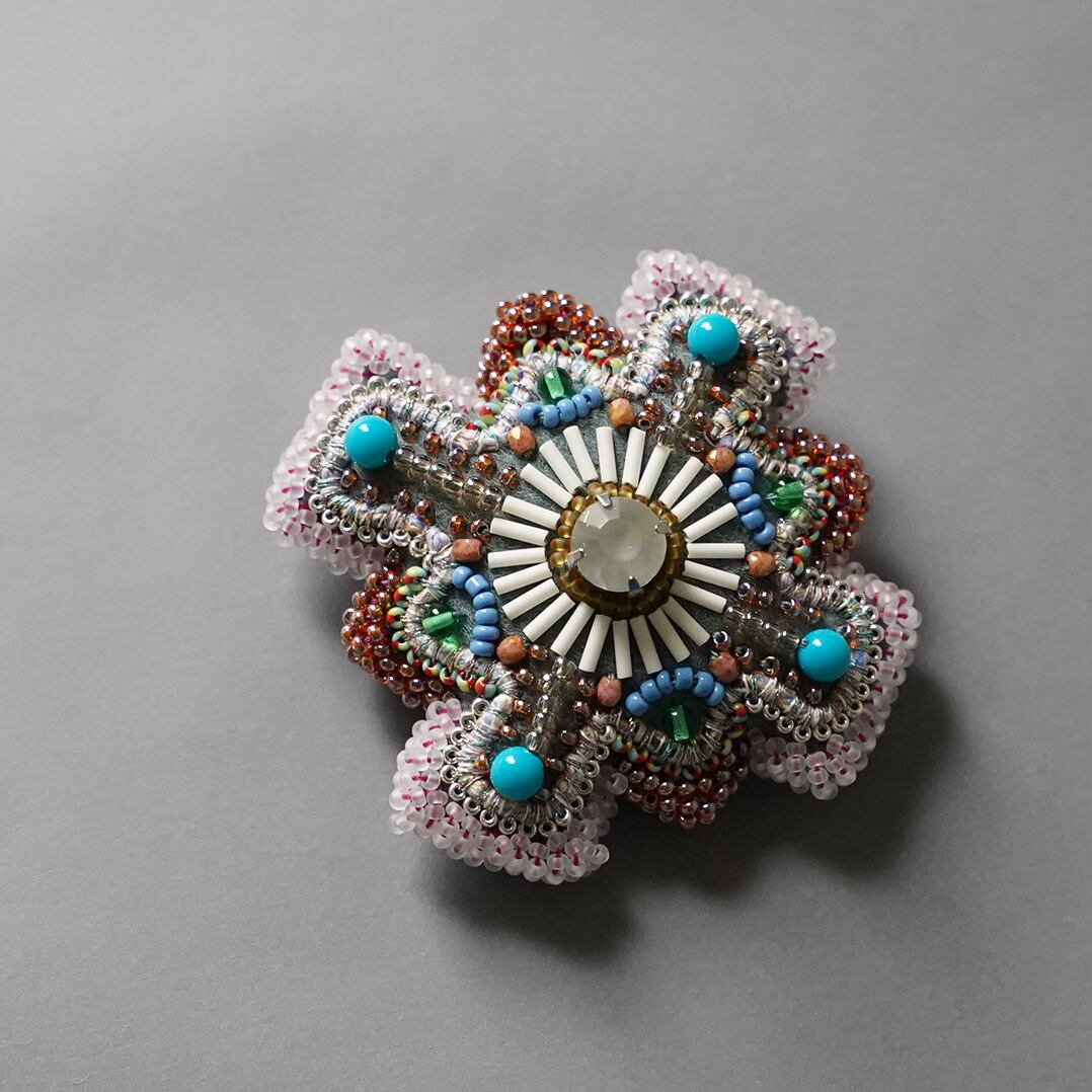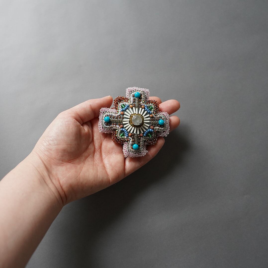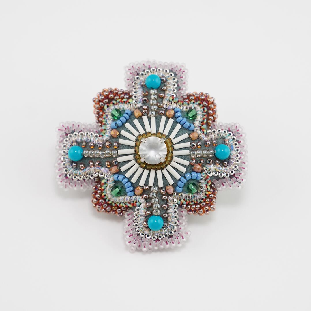 変形クロスのブローチ 9 ビーズ刺繍 一点もの グリーン ホワイト グレー ブルー おおぶり クリスマス ビジュー