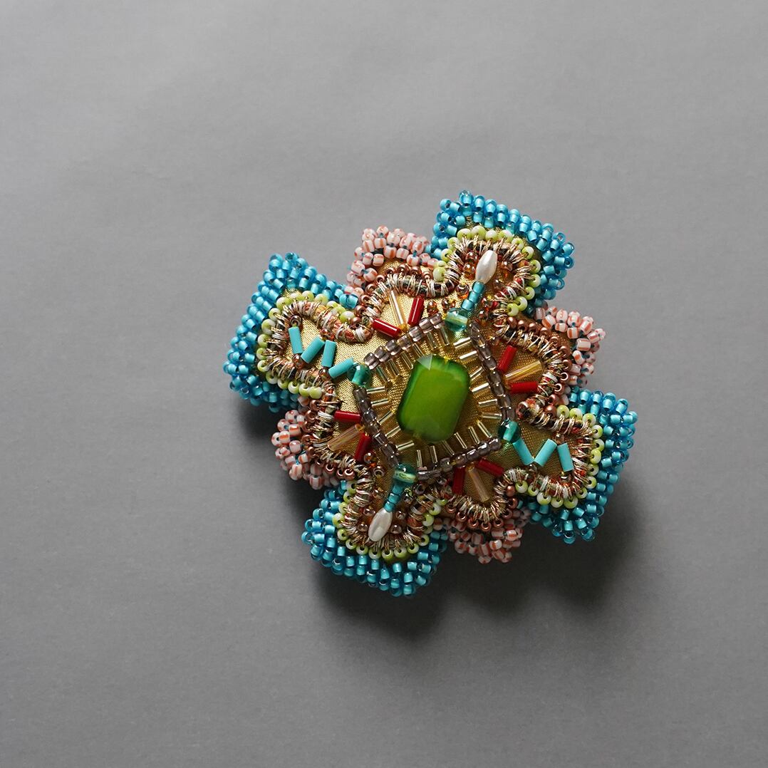 変形クロスのブローチ 10 ビーズ刺繍 一点もの イエロー グリーン ブルー おおぶり クリスマス サテン