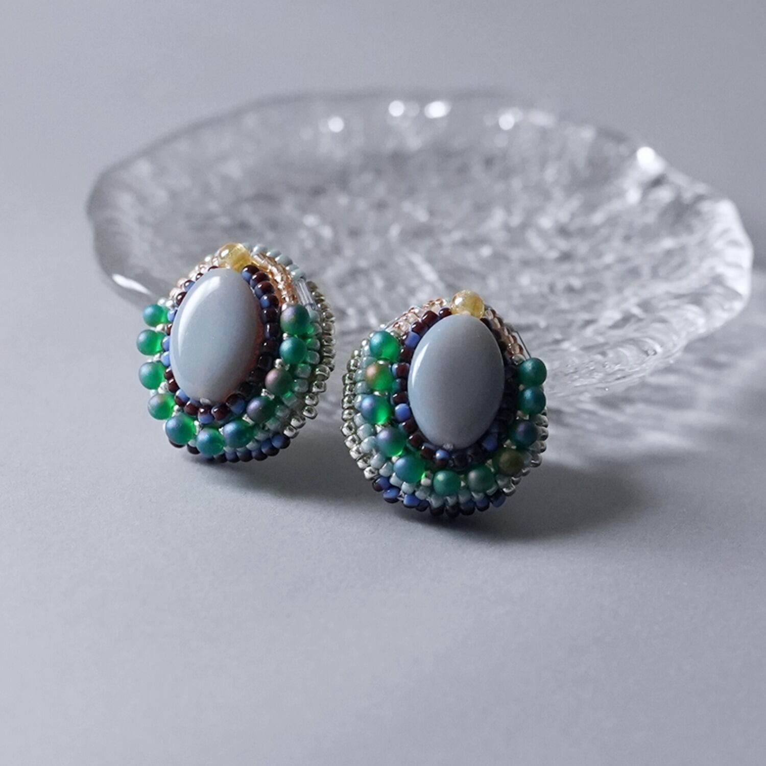 メインのビーズを引き立てるように細かなビーズを配置し、華やかなデザインに仕上げました。