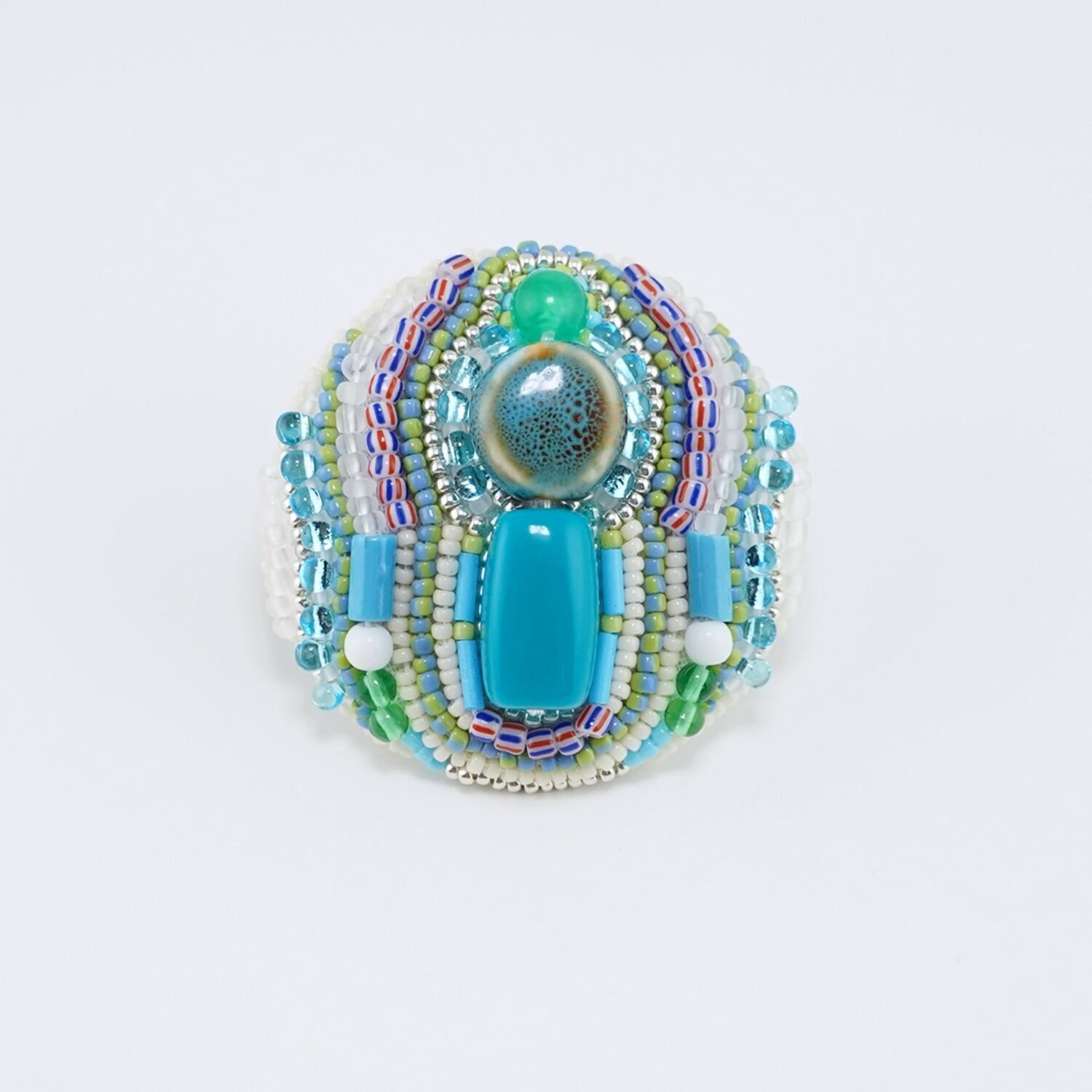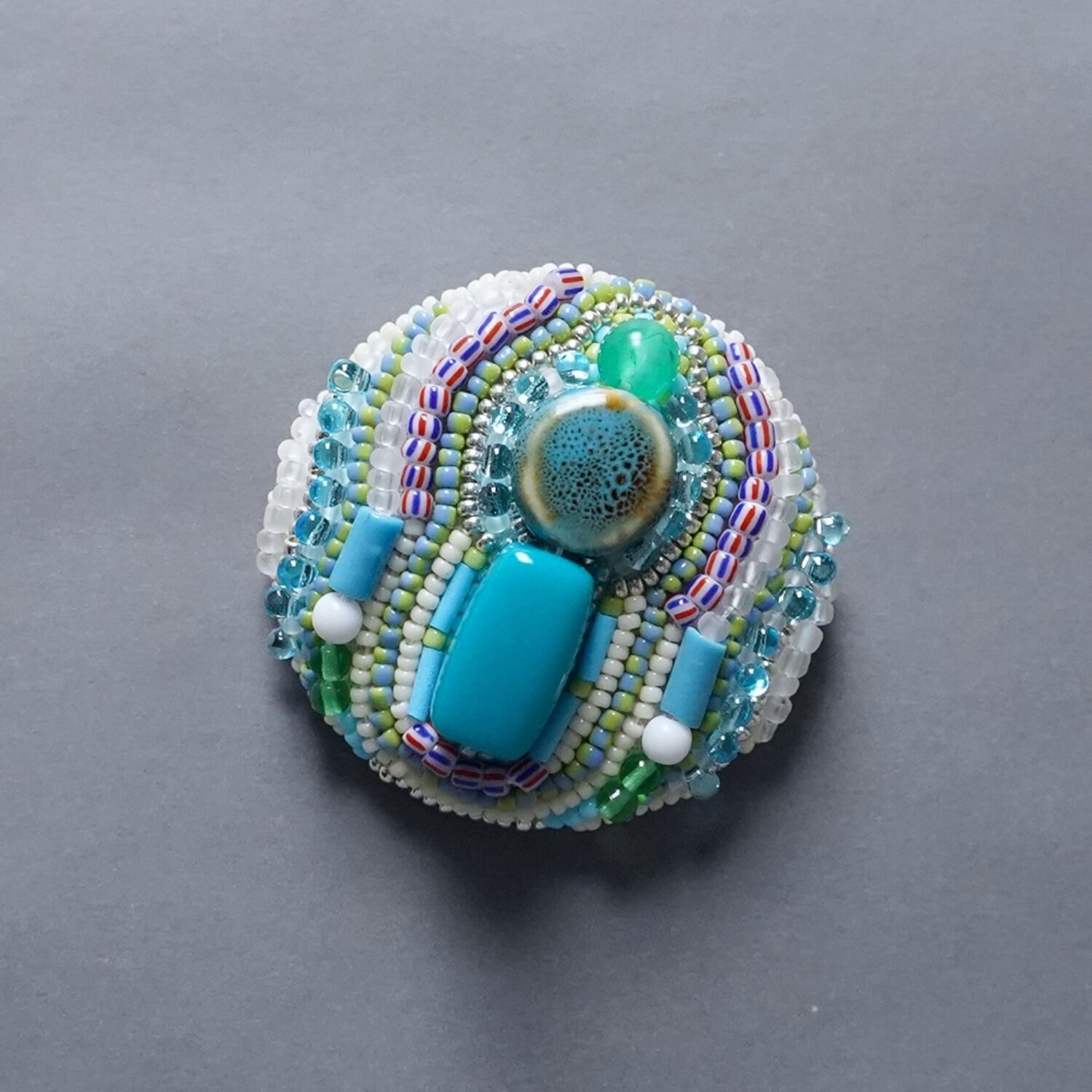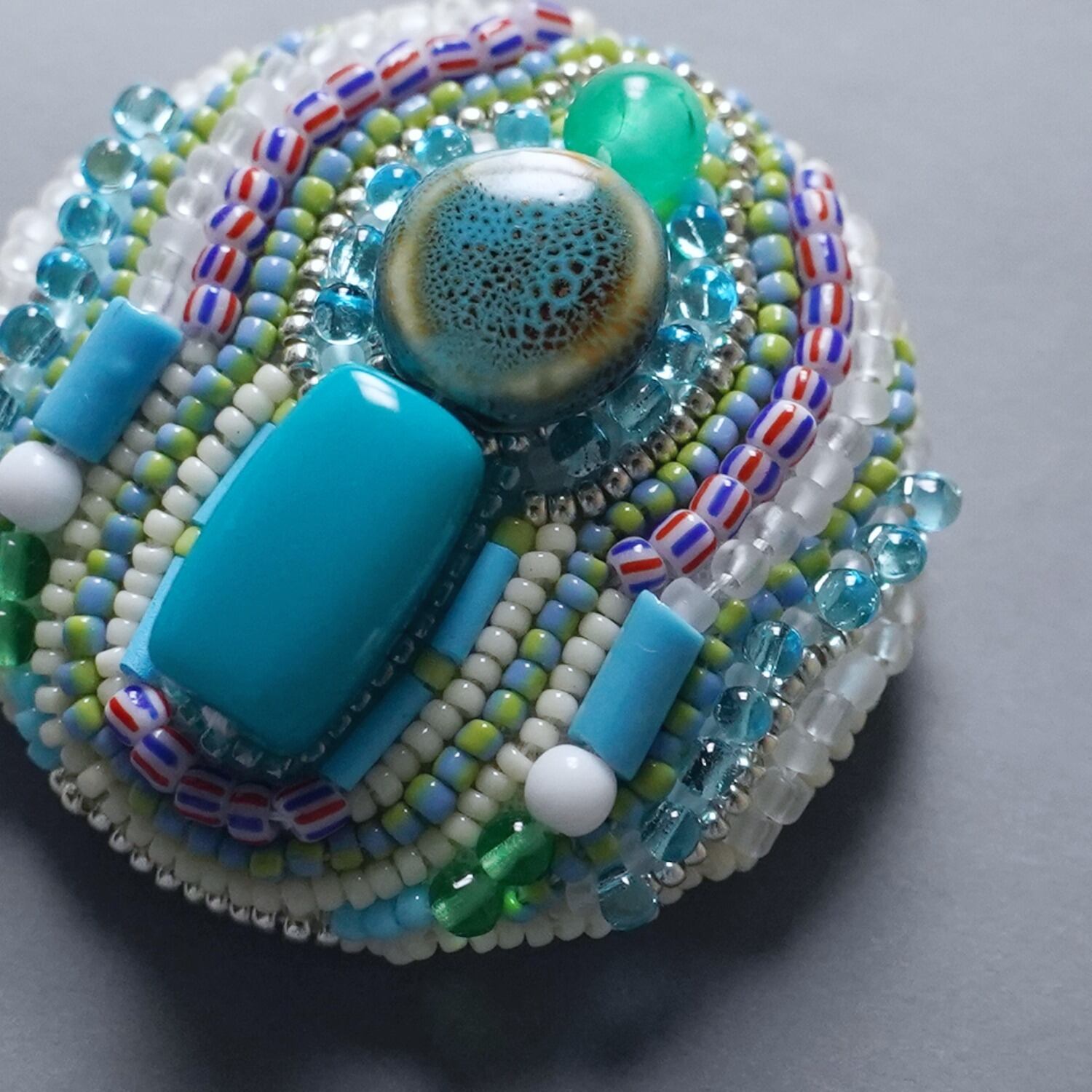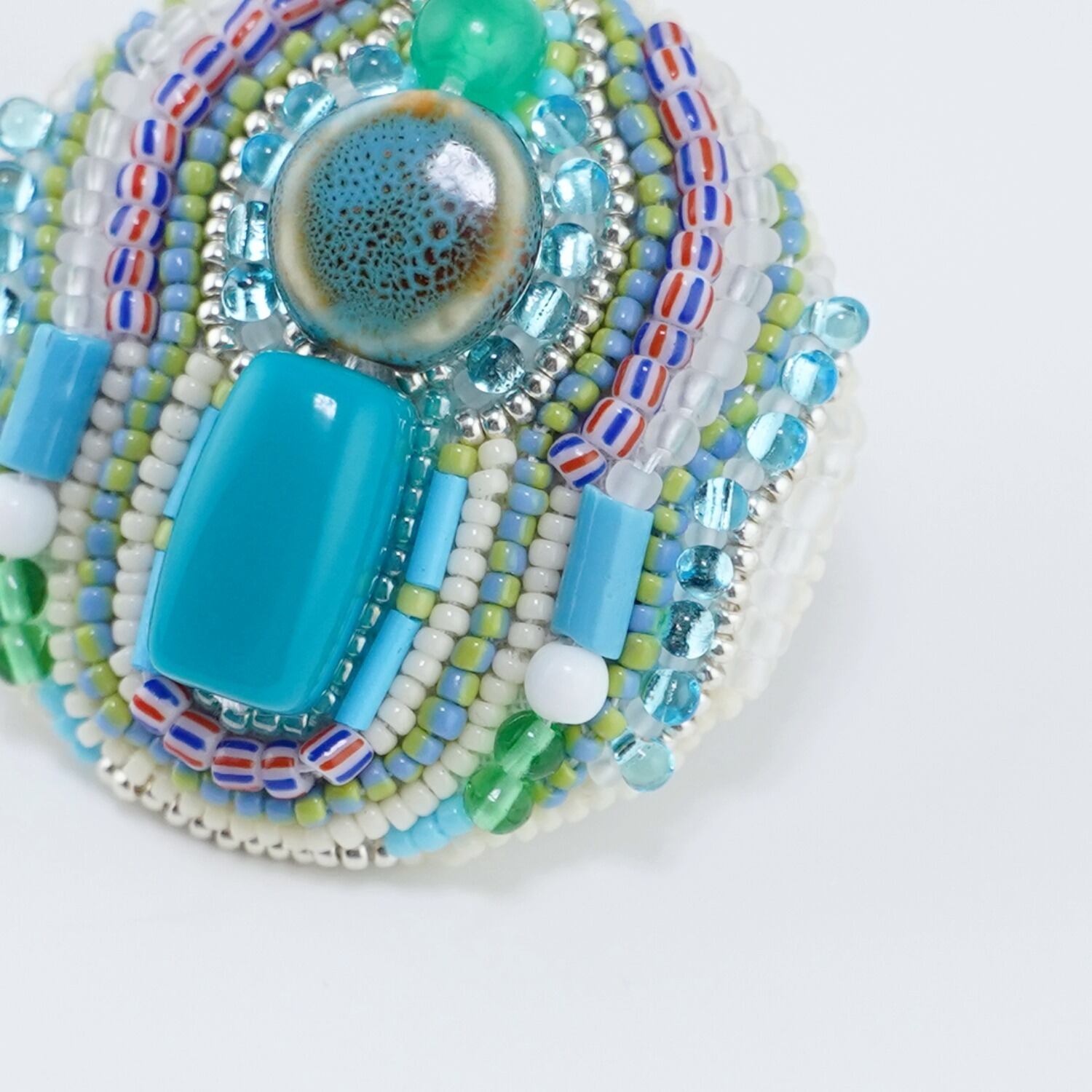 そのビーズを引き立てるように隙間なく刺繍をすると、カラフルでにぎやかで、まるでおしゃべりをしているように仕上がります。