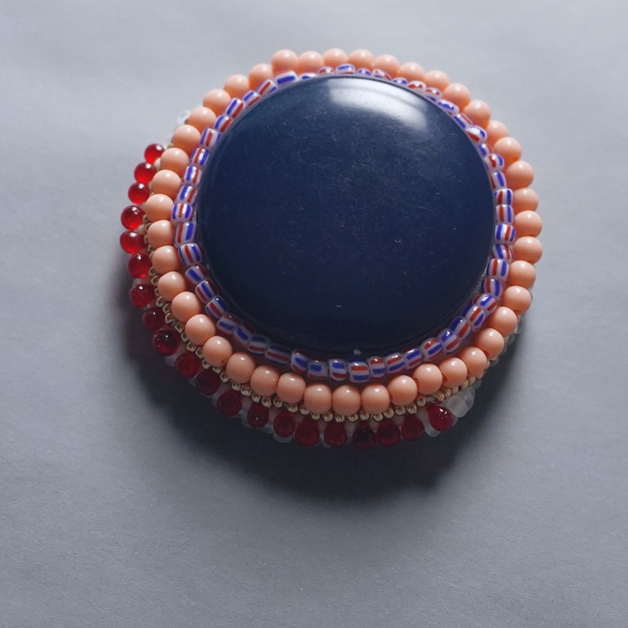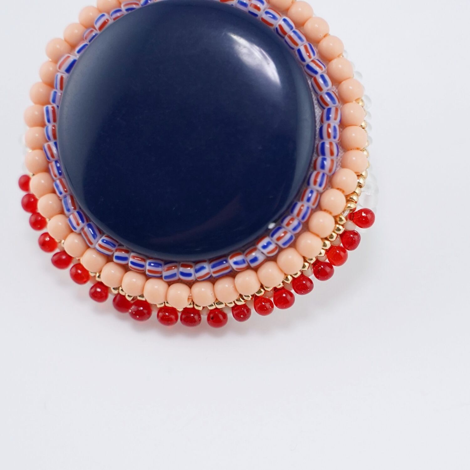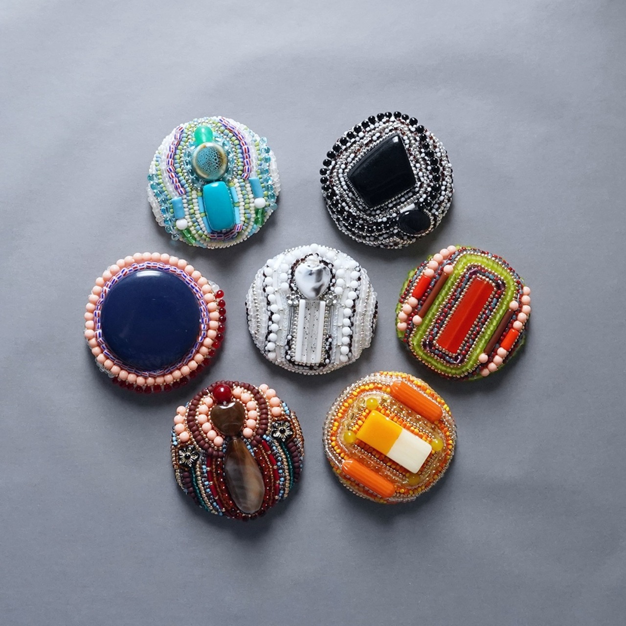 そのビーズを引き立てるように隙間なく刺繍をすると、カラフルでにぎやかで、まるでおしゃべりをしているように仕上がります。