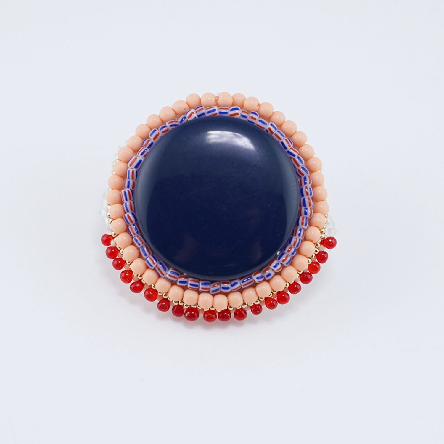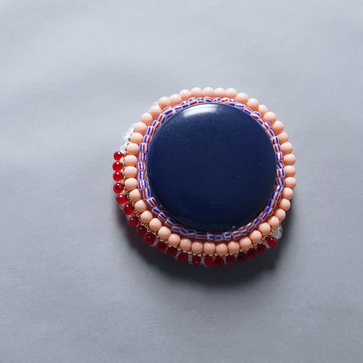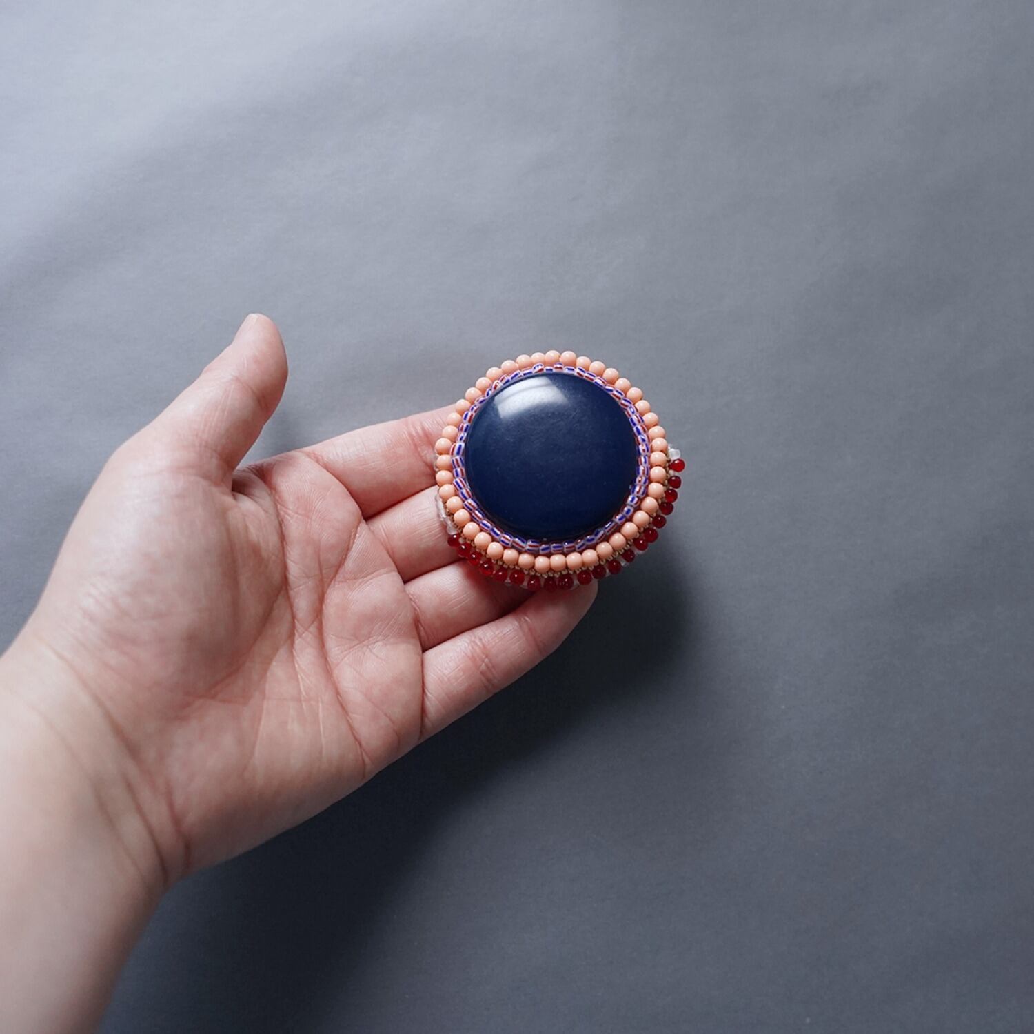 そのビーズを引き立てるように隙間なく刺繍をすると、カラフルでにぎやかで、まるでおしゃべりをしているように仕上がります。