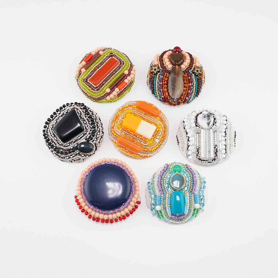 そのビーズを引き立てるように隙間なく刺繍をすると、カラフルでにぎやかで、まるでおしゃべりをしているように仕上がります。