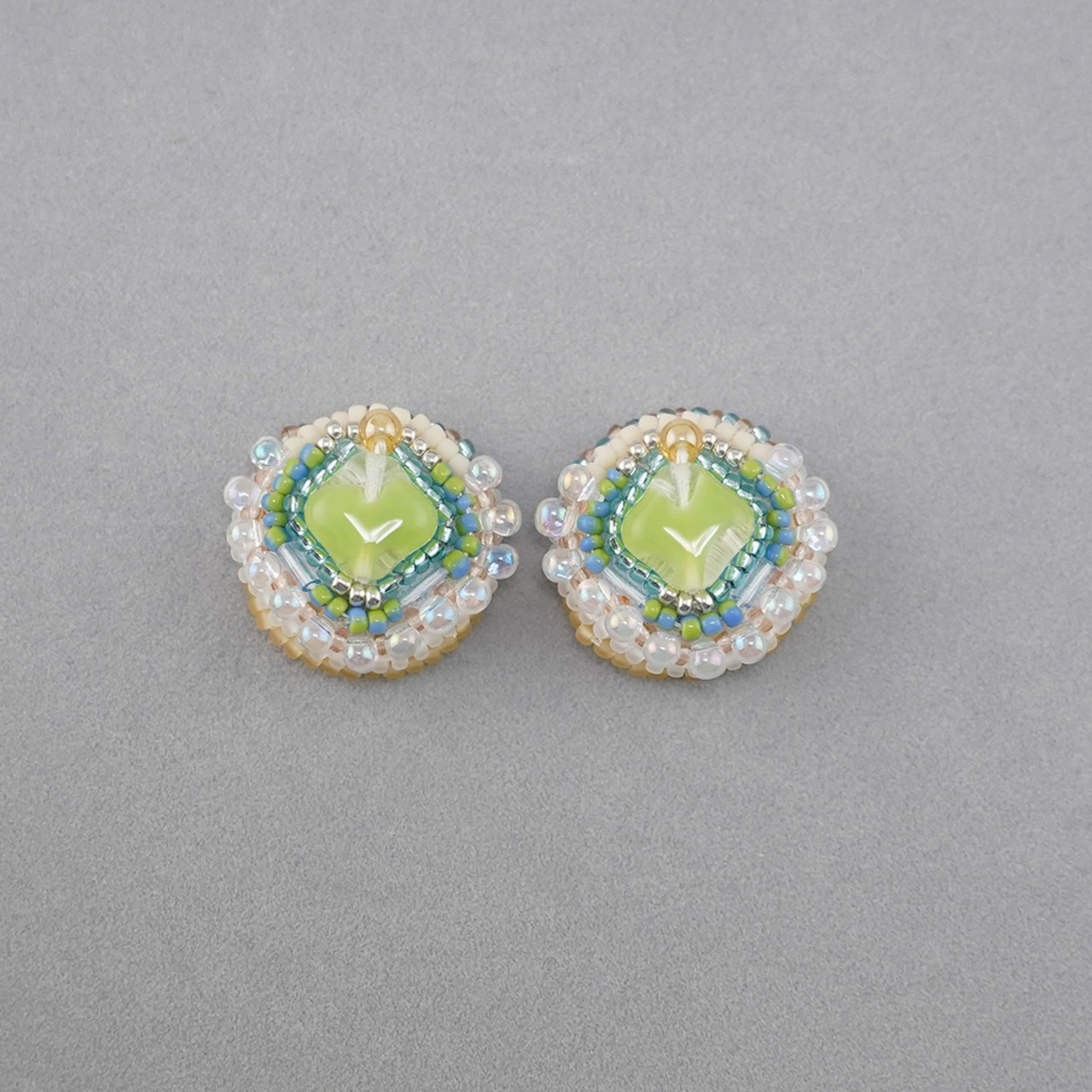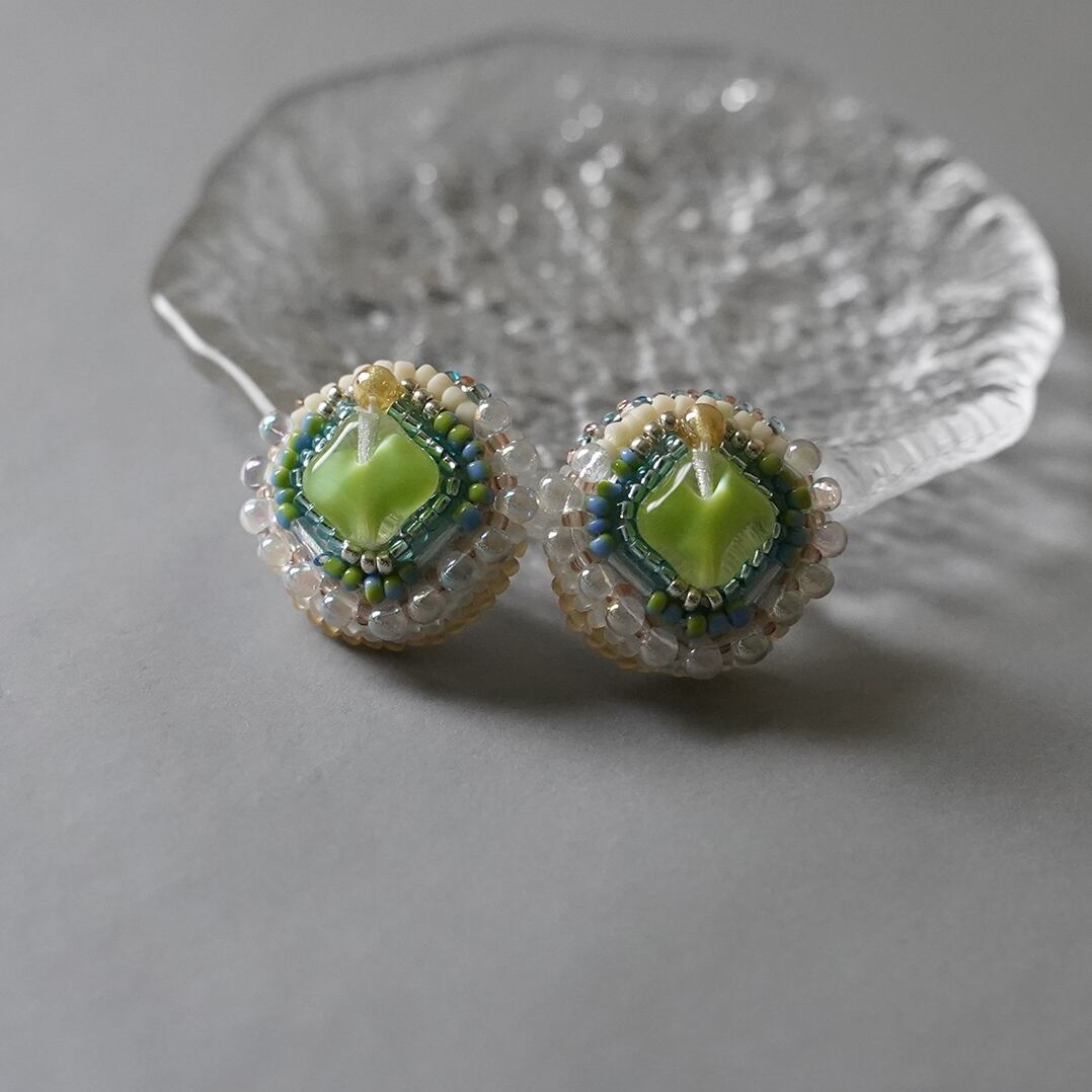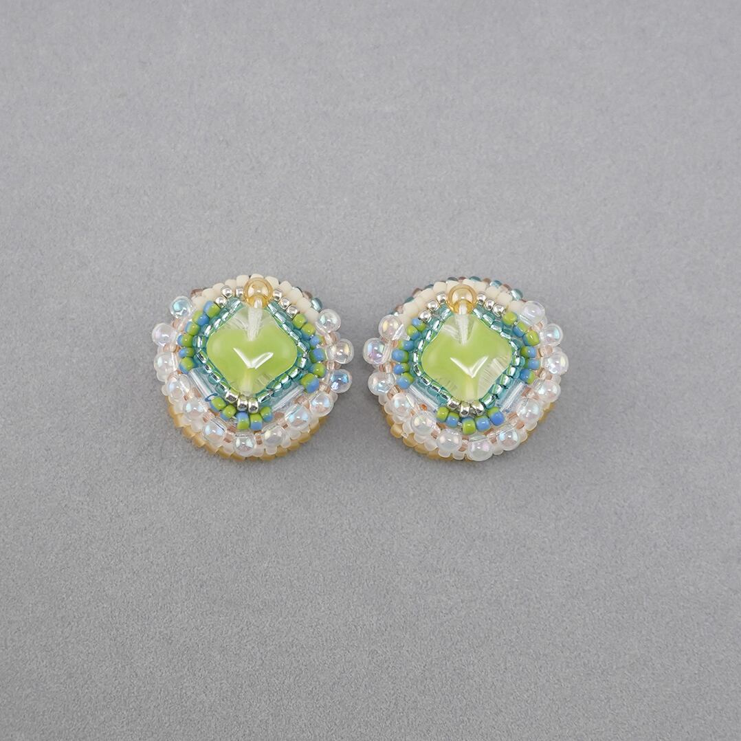 ビーズ刺繍のイヤリング ピアス 31 グリーン クリア イエロー おおぶり サージカルステンレス 一点もの 個性的