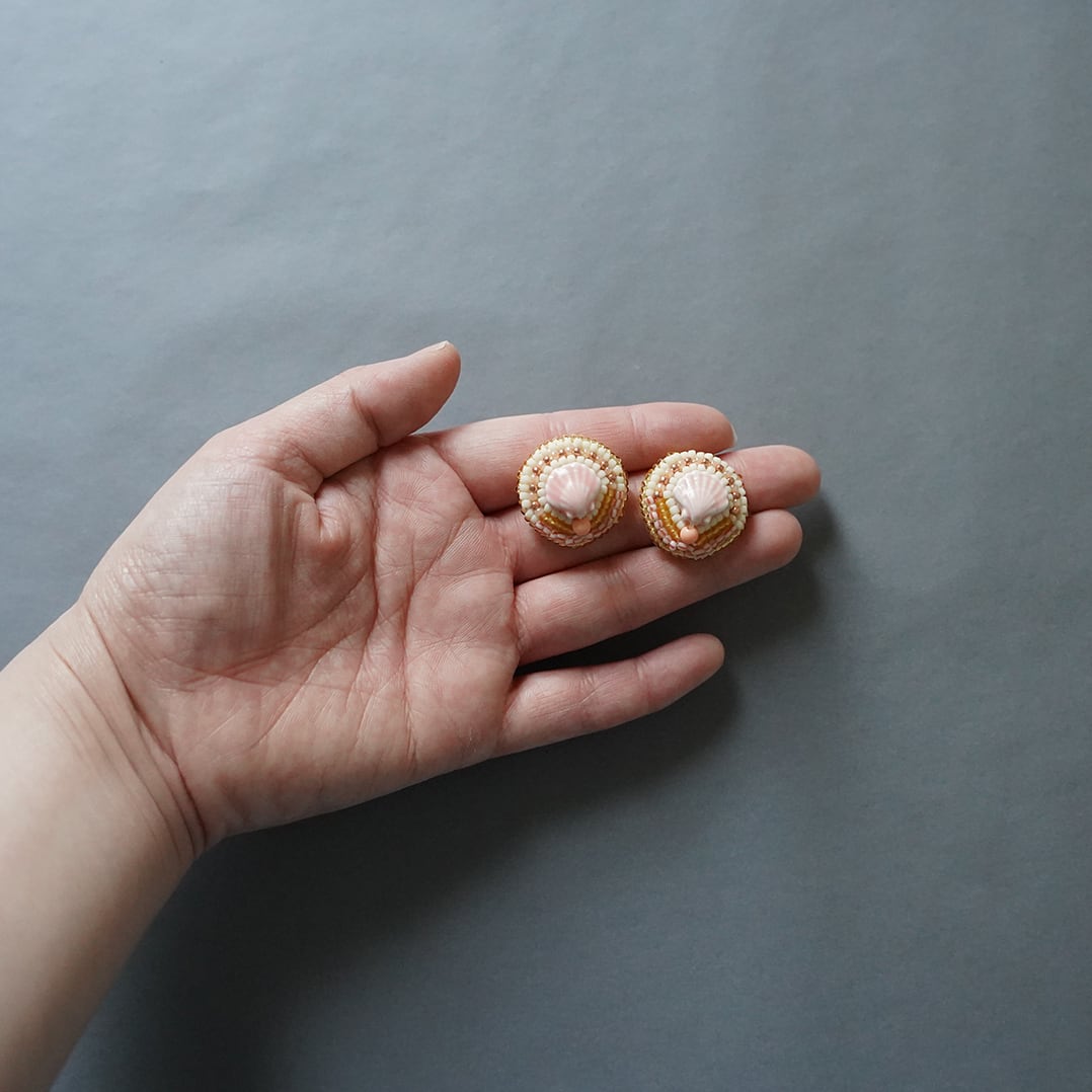 ビーズ刺繍のイヤリング ピアス 36 ピンク オレンジ 貝がら おおぶり サージカルステンレス 一点もの 個性的