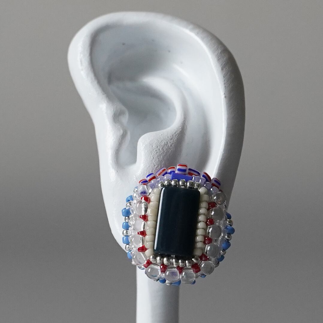 ビーズ刺繍のイヤリング ピアス 37 ネイビー トリコロール おおぶり サージカルステンレス 一点もの 個性的