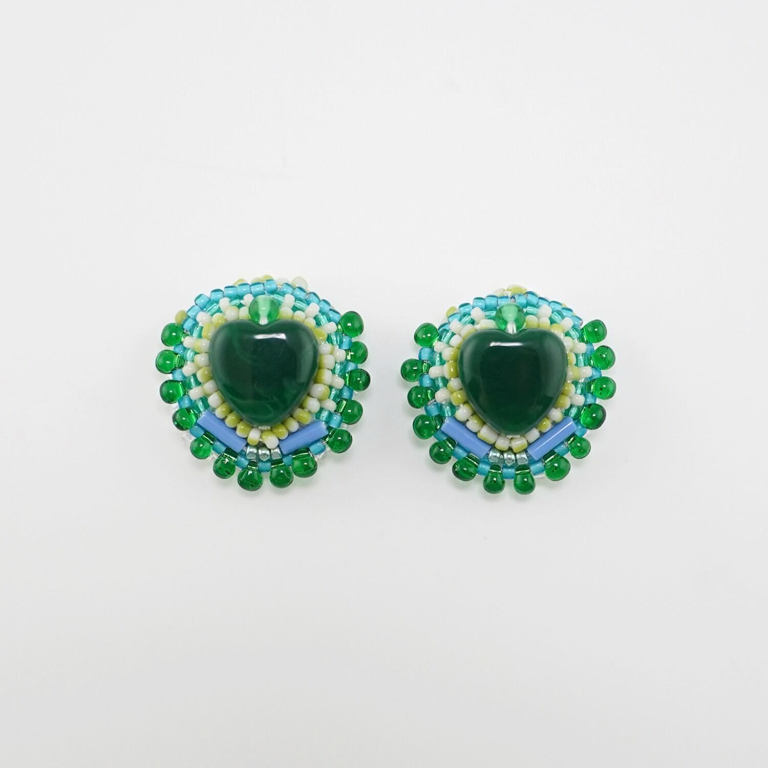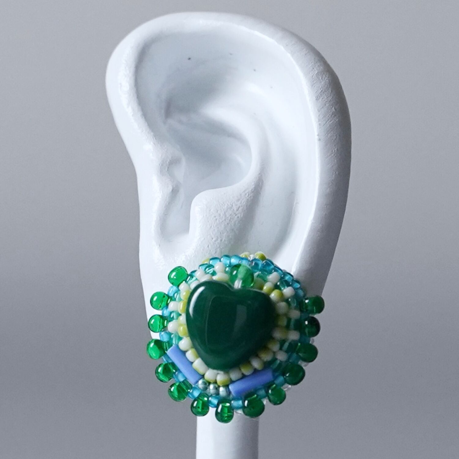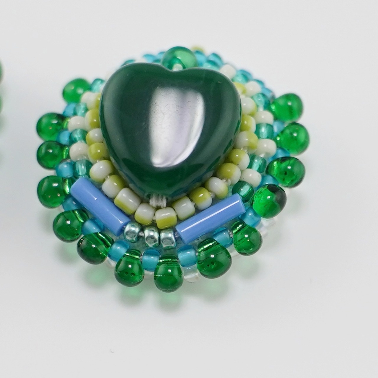ビーズ刺繍のイヤリング ピアス 38 グリーン ハート ポップ おおぶり サージカルステンレス 一点もの 個性的