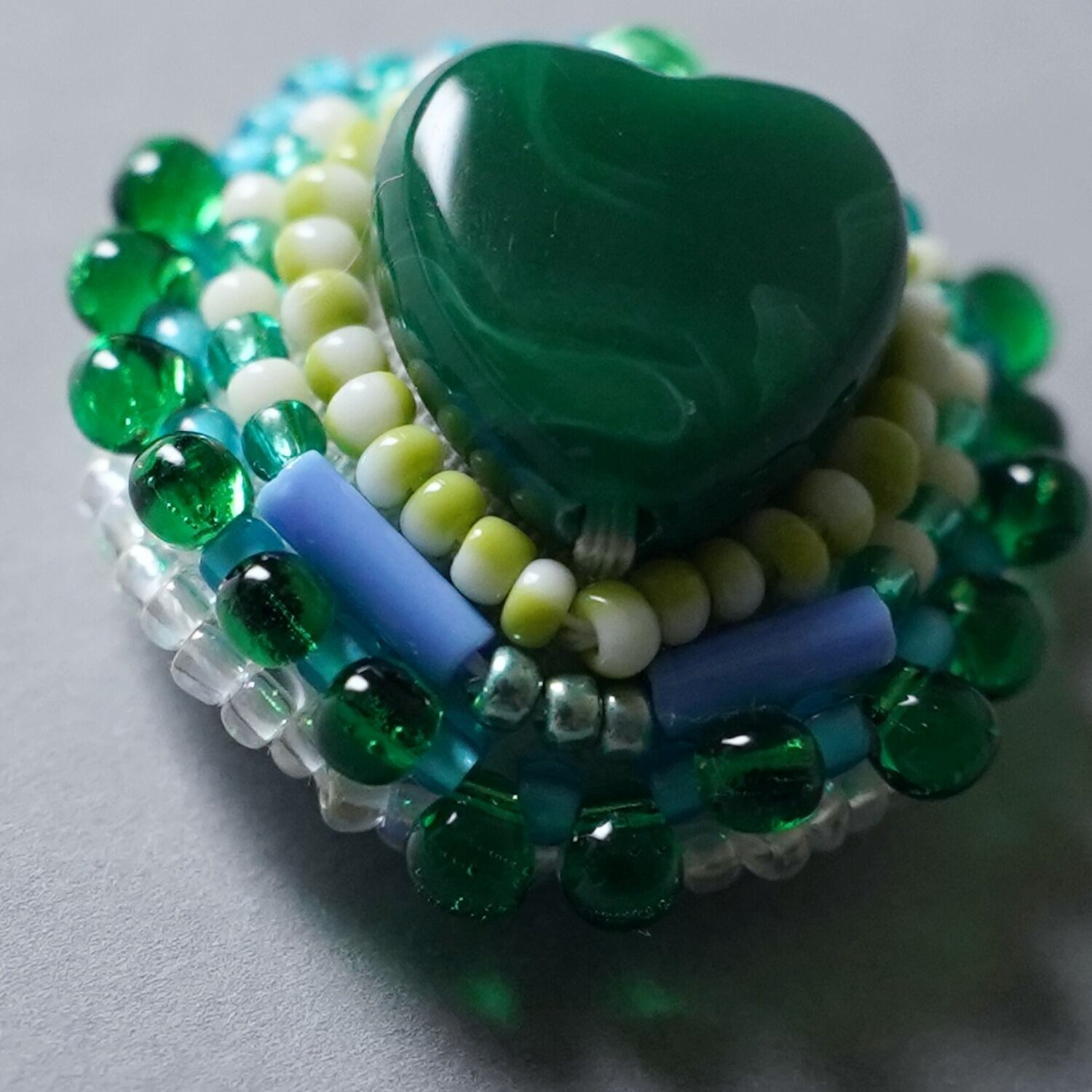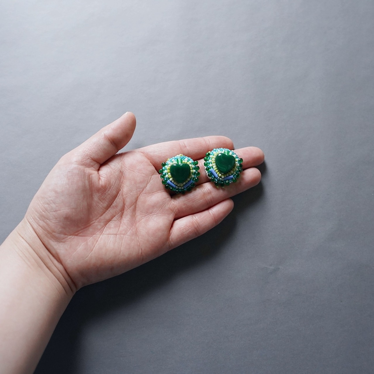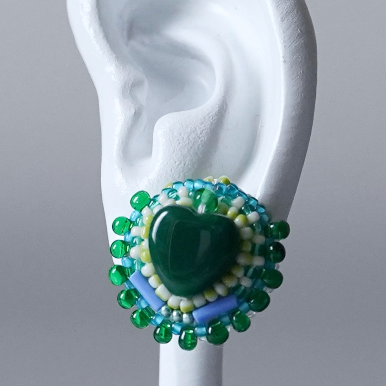 ビーズ刺繍のイヤリング ピアス 38 グリーン ハート ポップ おおぶり サージカルステンレス 一点もの 個性的