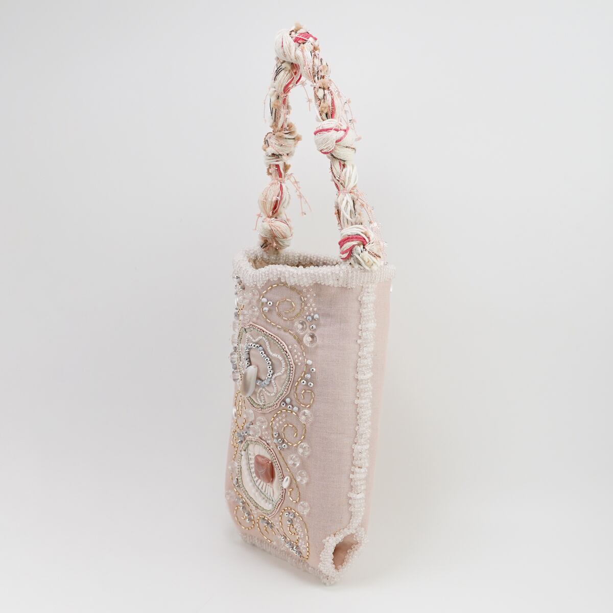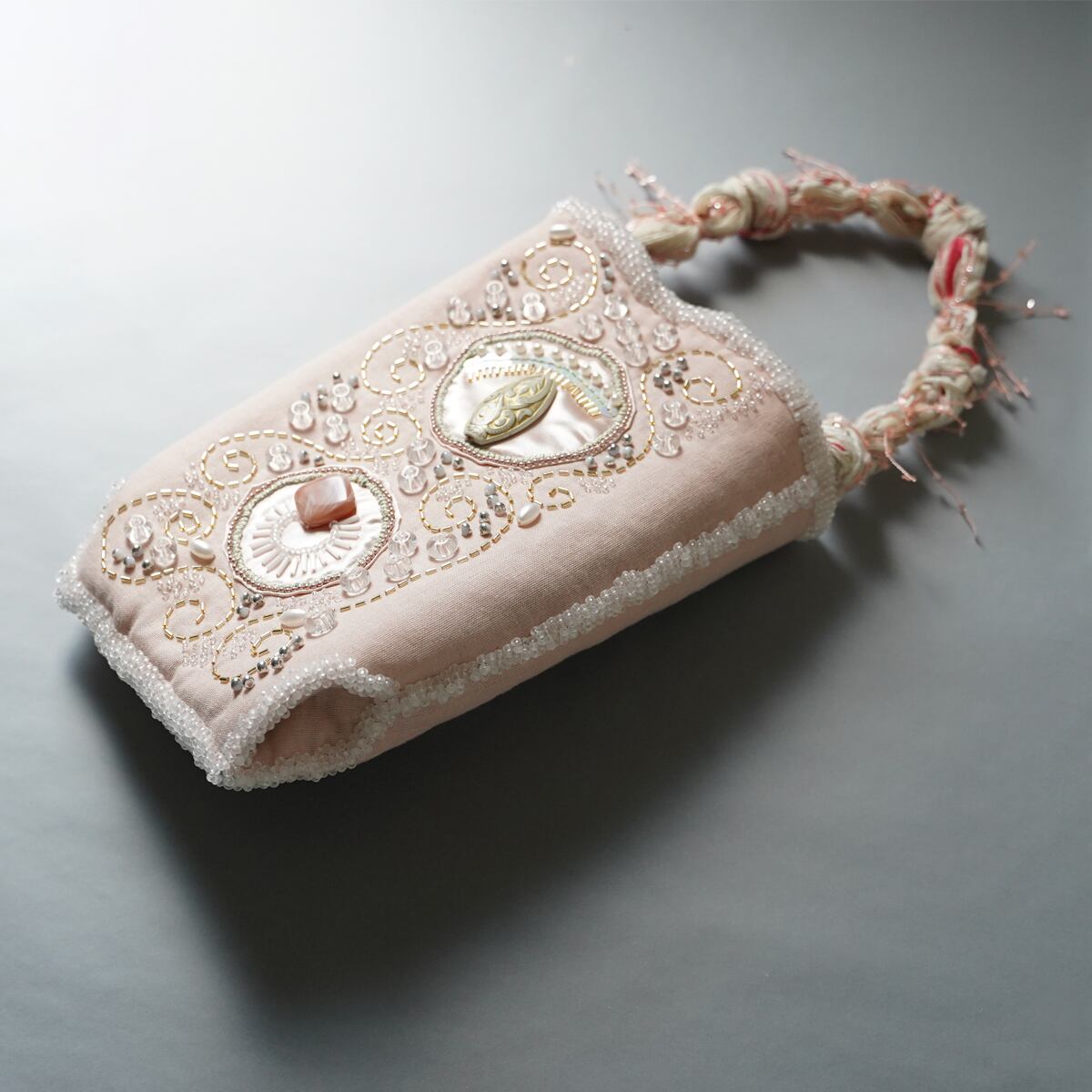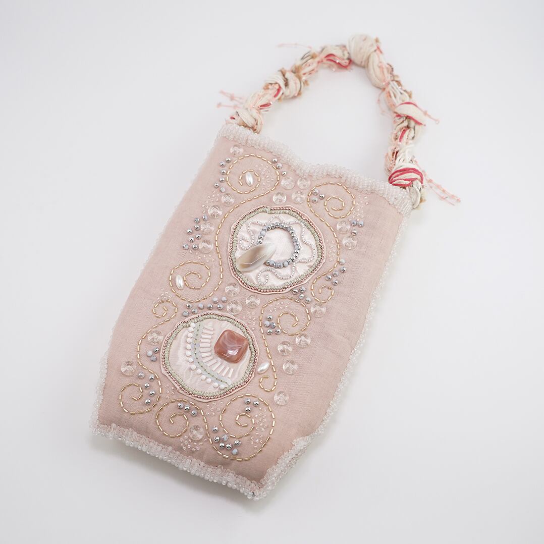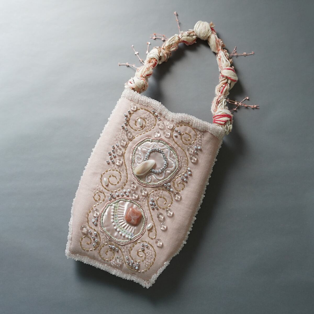 とっておきのハンドバッグ3 縦長 両面刺繍 ビーズ刺繍 ピンク ホワイト ガーゼ 長財布 一点もの 個性的