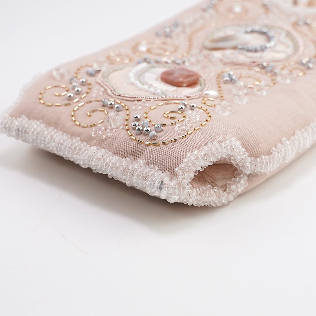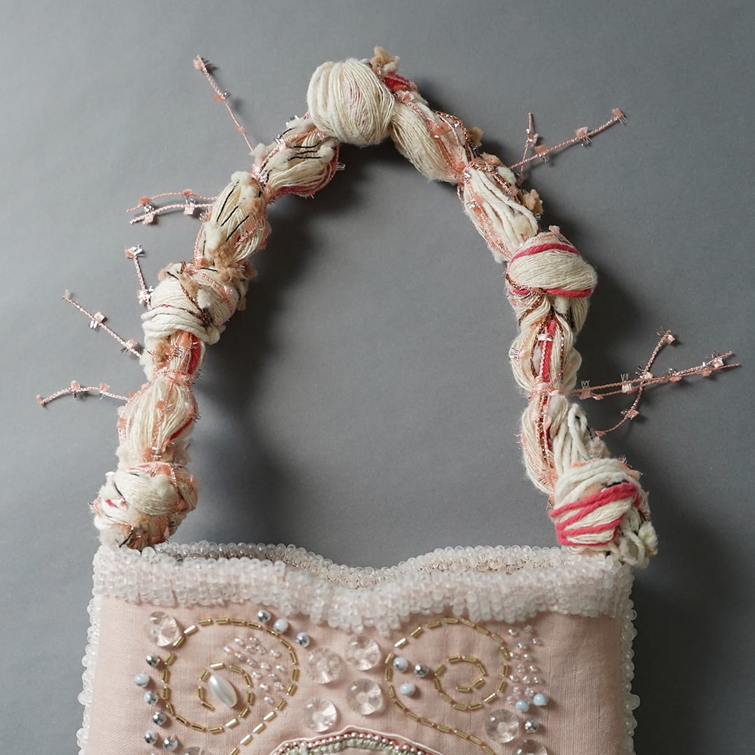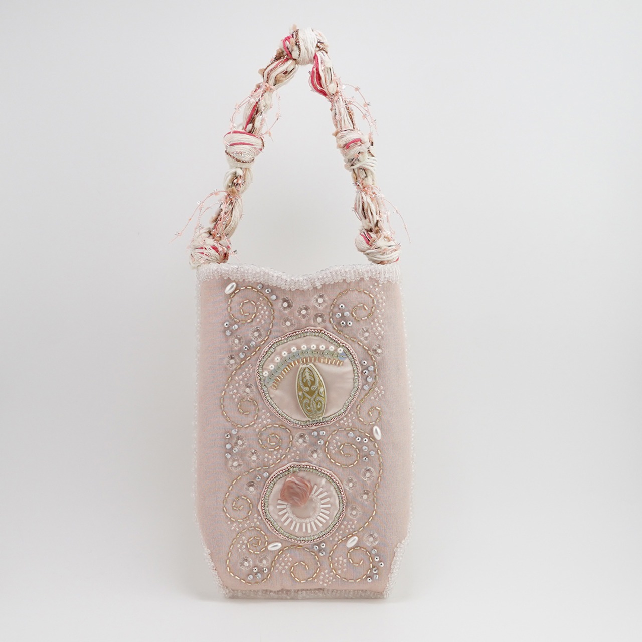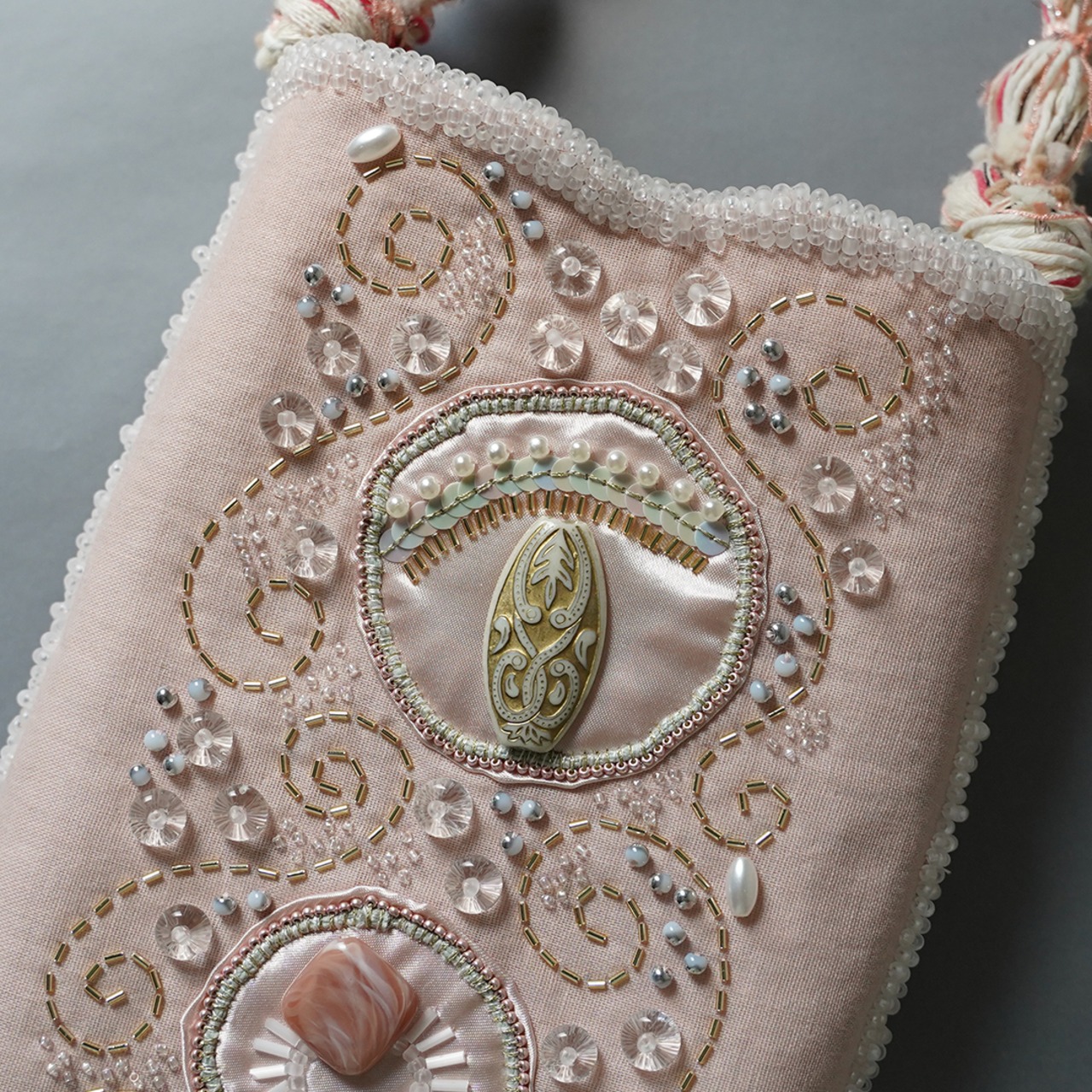 とっておきのハンドバッグ3 縦長 両面刺繍 ビーズ刺繍 ピンク ホワイト ガーゼ 長財布 一点もの 個性的
