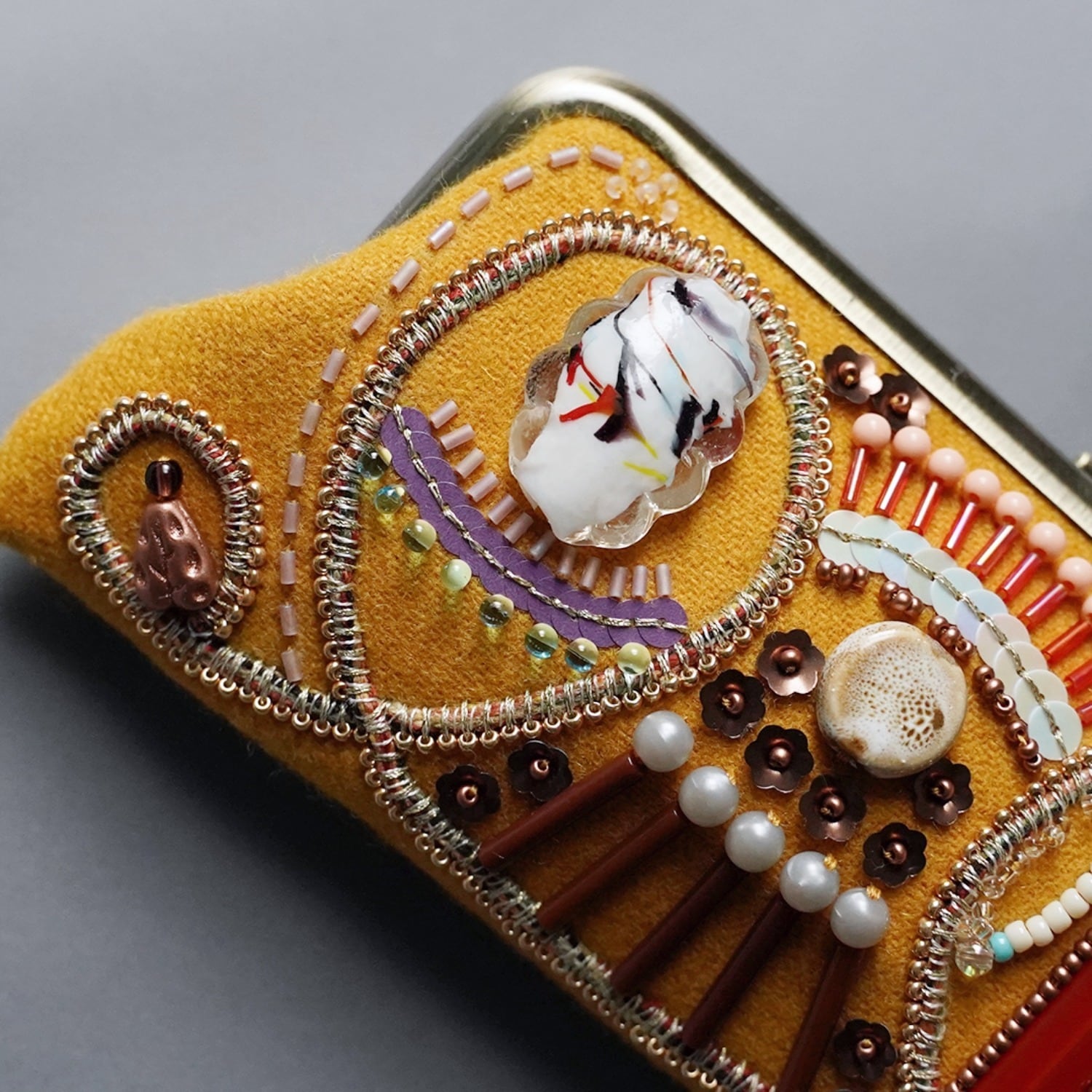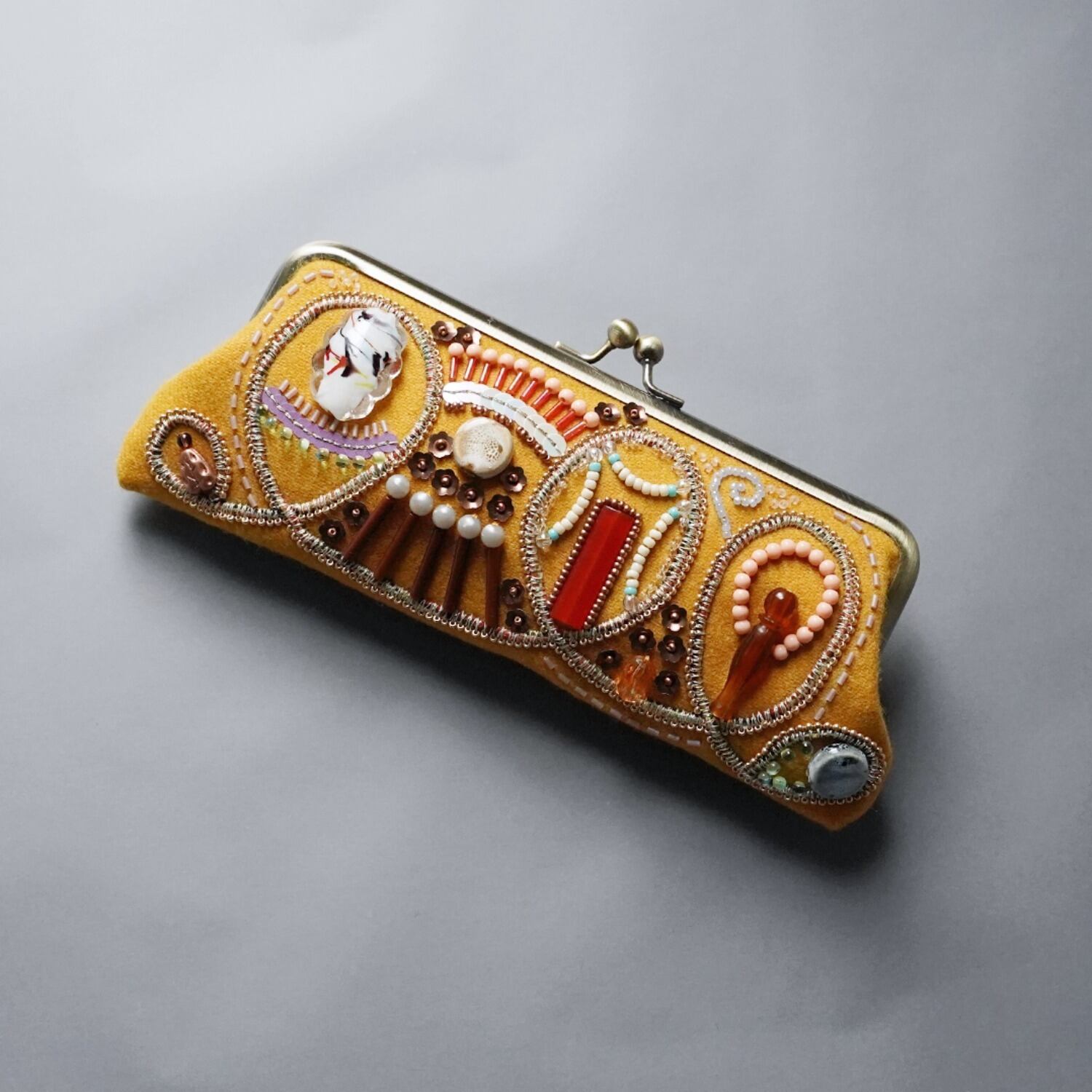 眼鏡ケースにも ビーズ刺繍のペンケースがま口 7 マスタード 一点もの 送料無料 敬老の日 母の日 ギフト