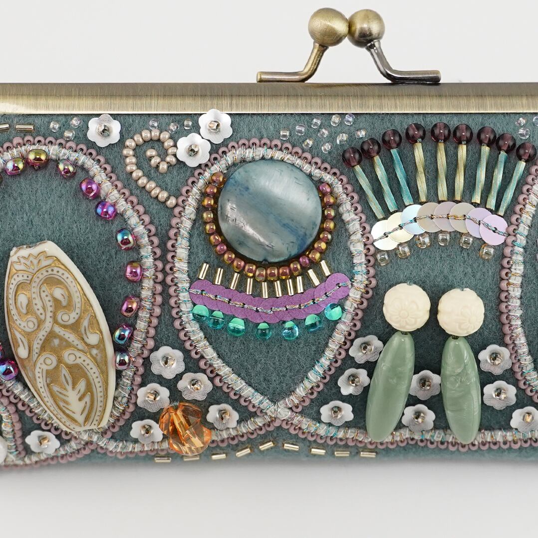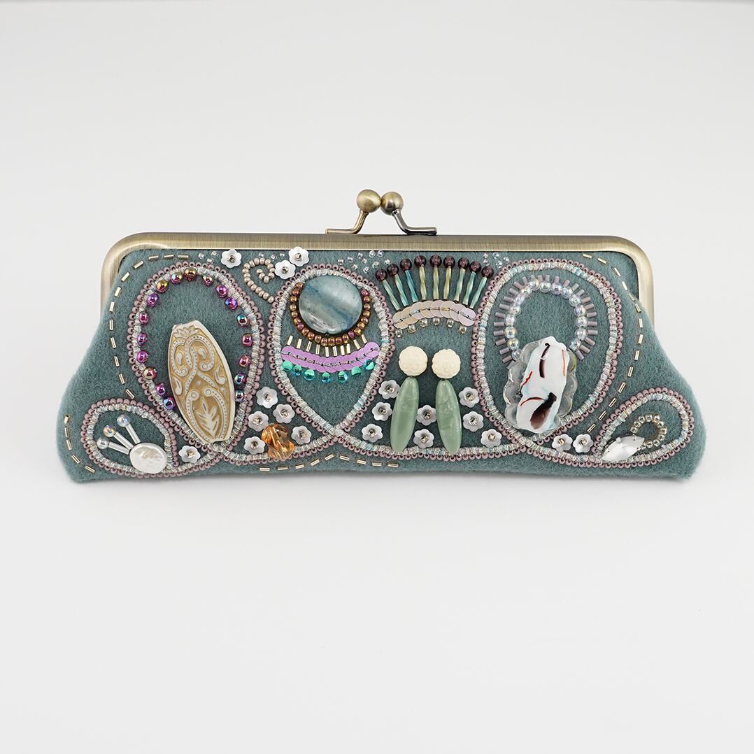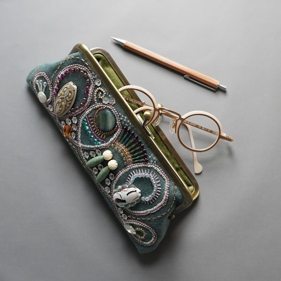 眼鏡ケースにも ビーズ刺繍のペンケースがま口 10 くすみグリーン 一点もの 送料無料 敬老の日 母の日 ギフト