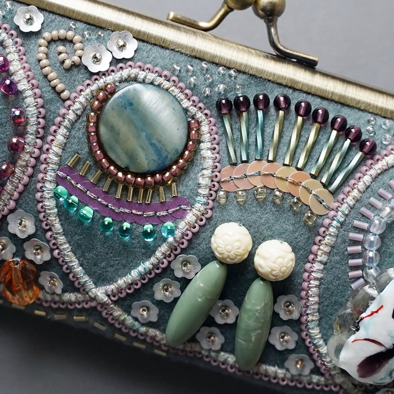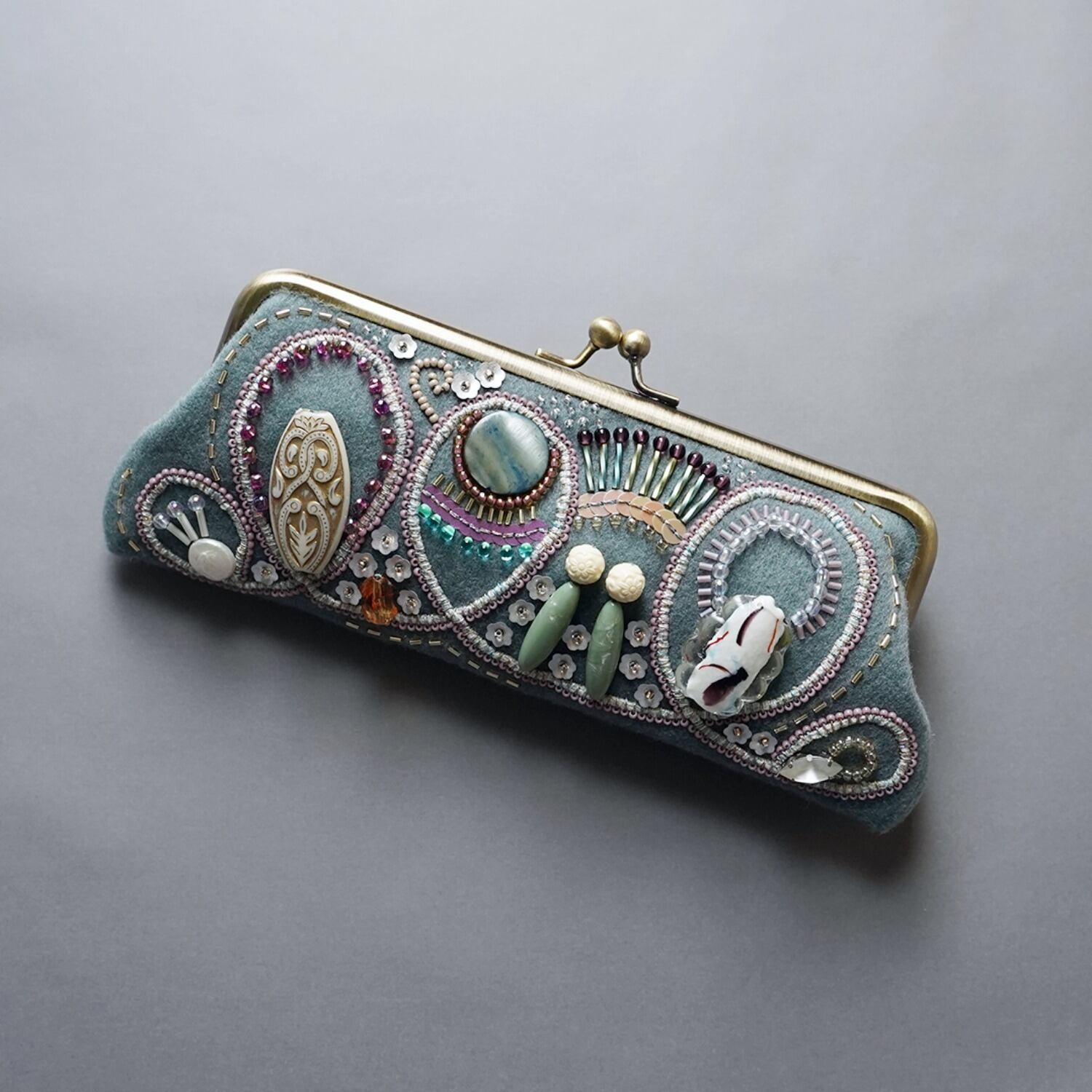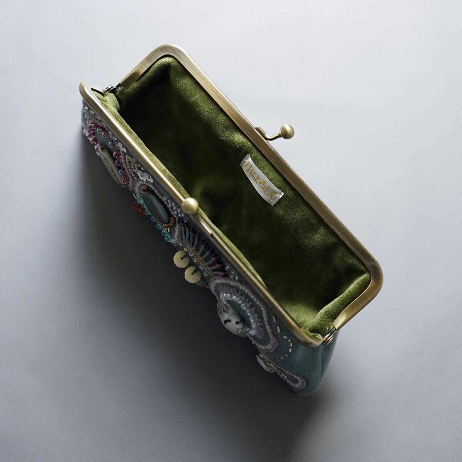 眼鏡ケースにも ビーズ刺繍のペンケースがま口 10 くすみグリーン 一点もの 送料無料 敬老の日 母の日 ギフト