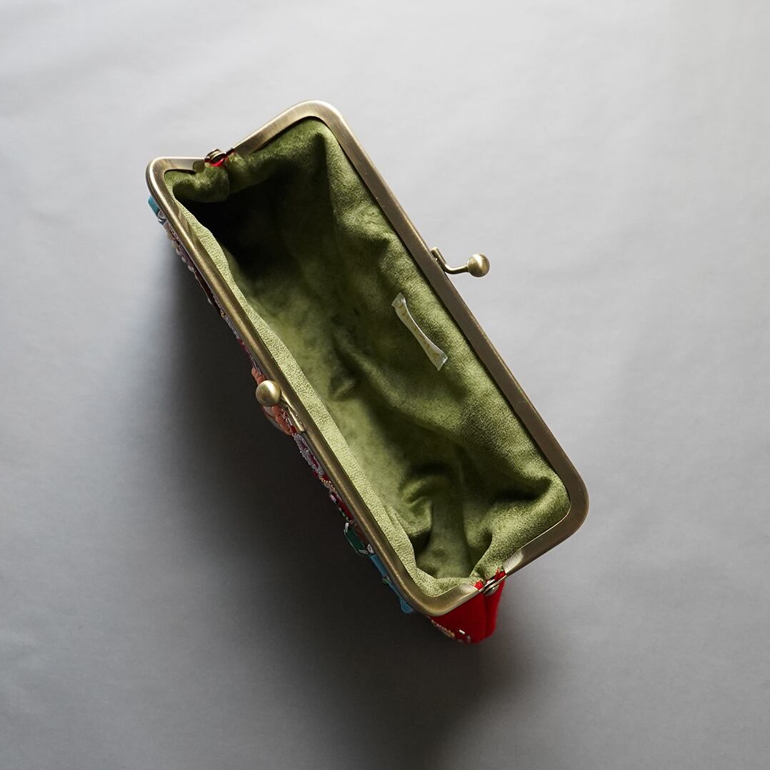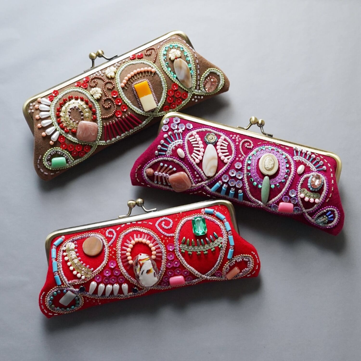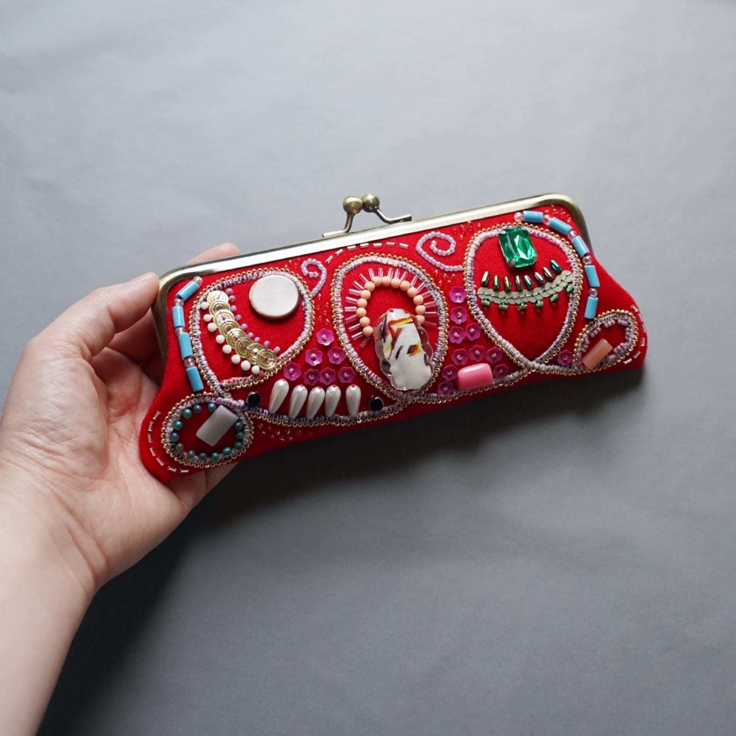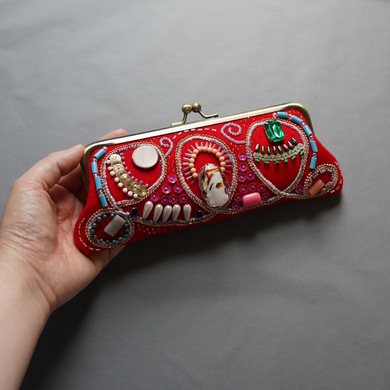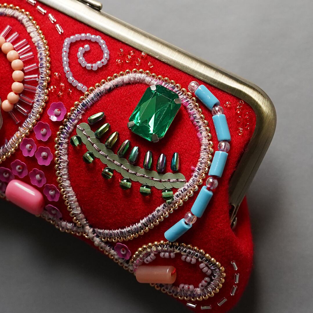 眼鏡ケースにも ビーズ刺繍のペンケースがま口 14 レッド 一点もの 送料無料 敬老の日 母の日 ギフト