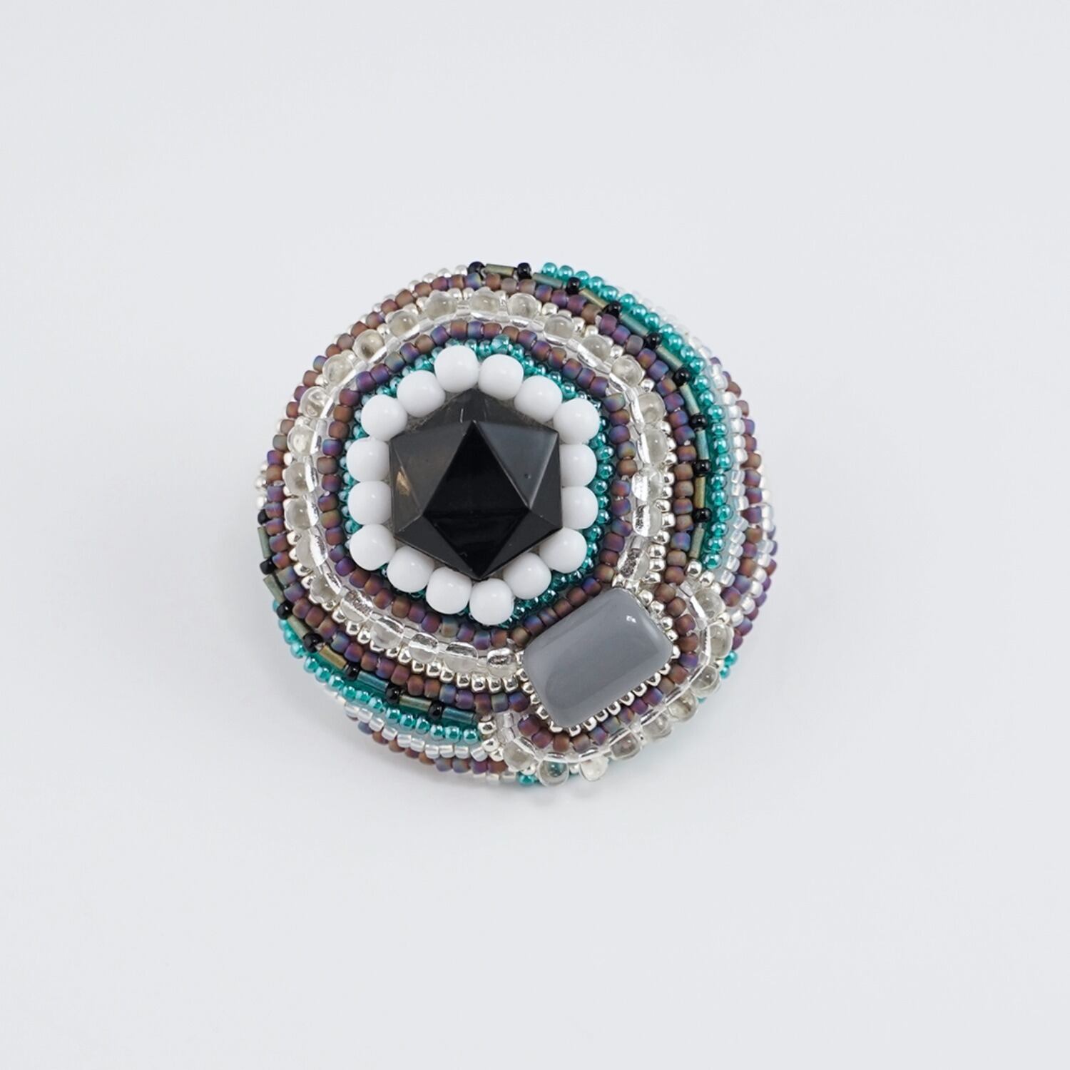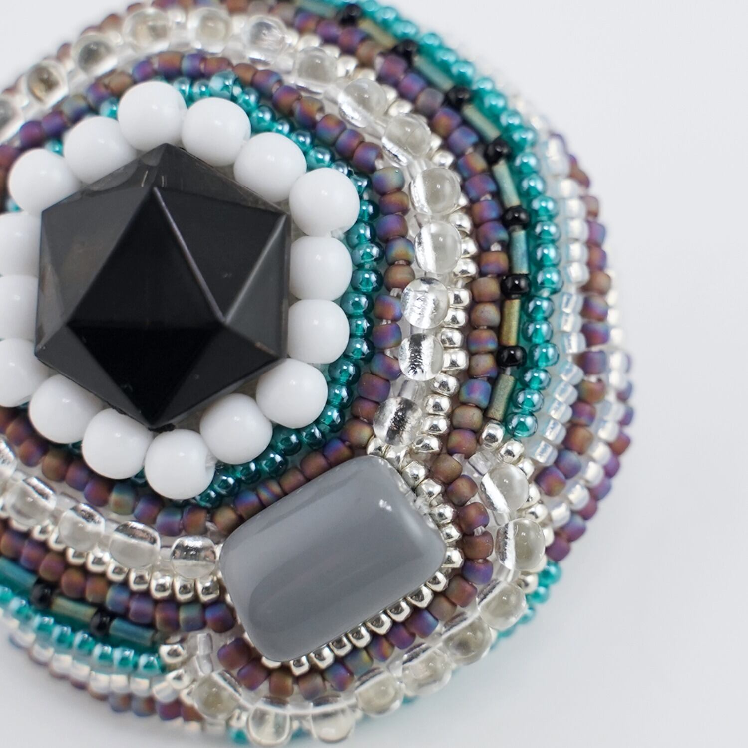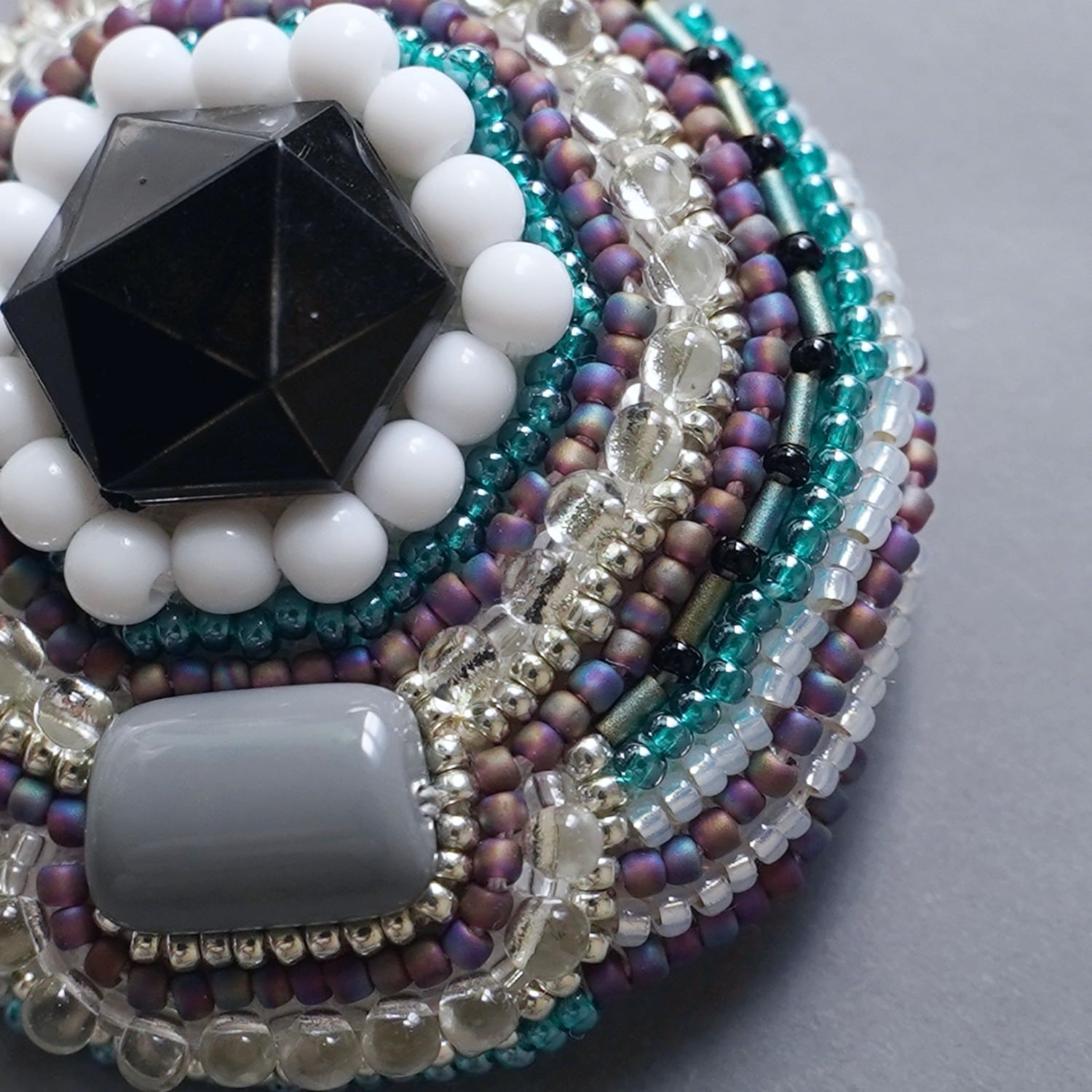 そのビーズを引き立てるように隙間なく刺繍をすると、カラフルでにぎやかで、まるでおしゃべりをしているように仕上がります。