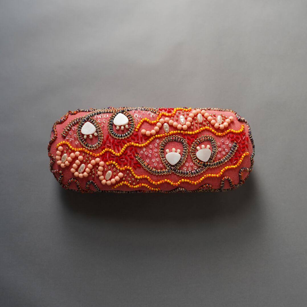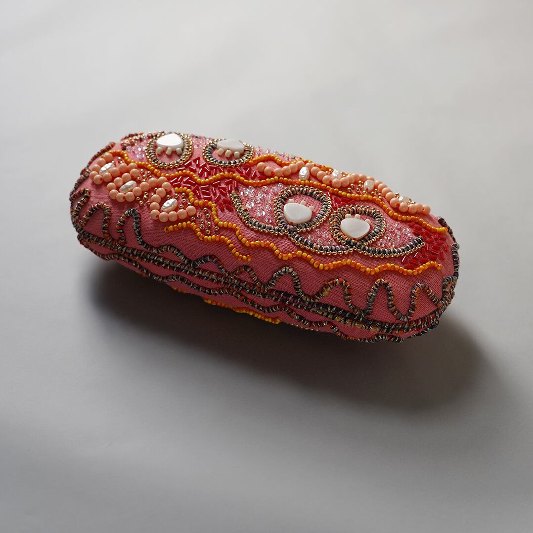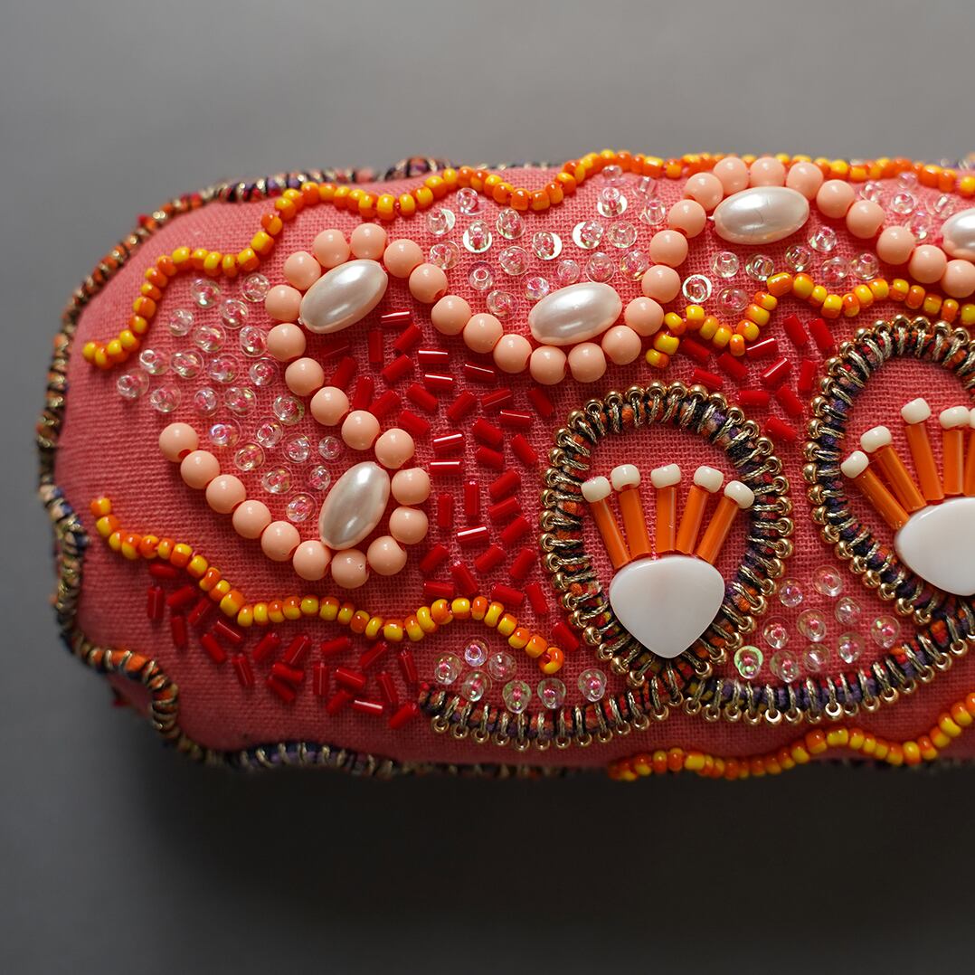 キルト芯を貼った生地に糸やビーズで細かな刺繍を施しました。