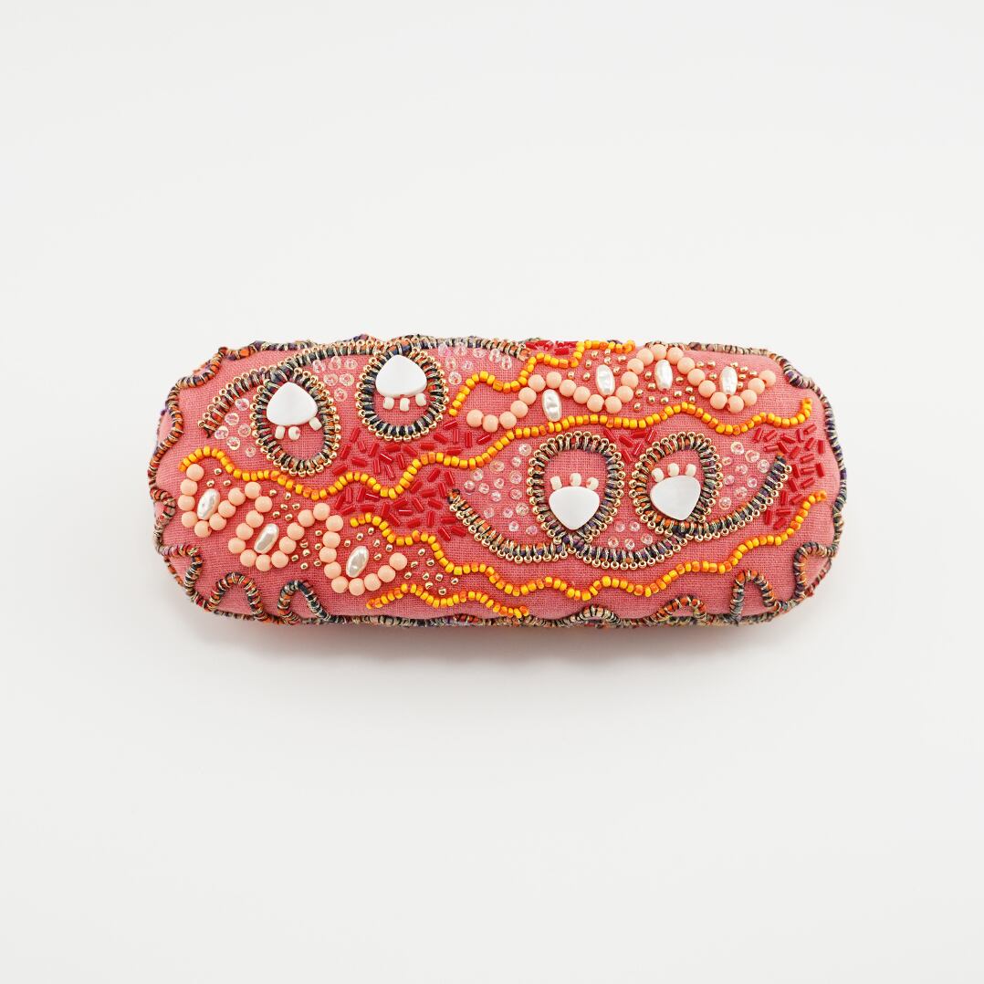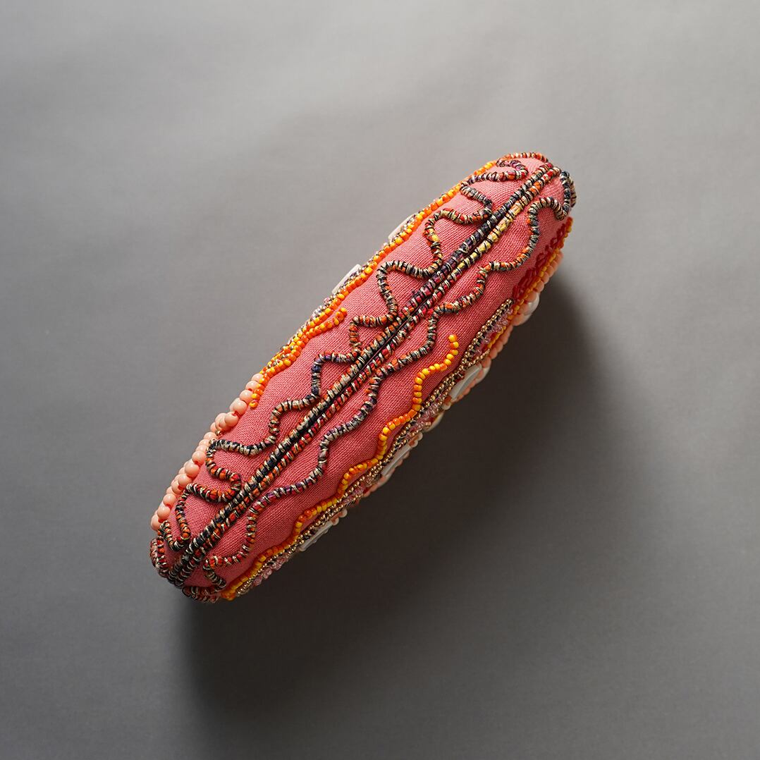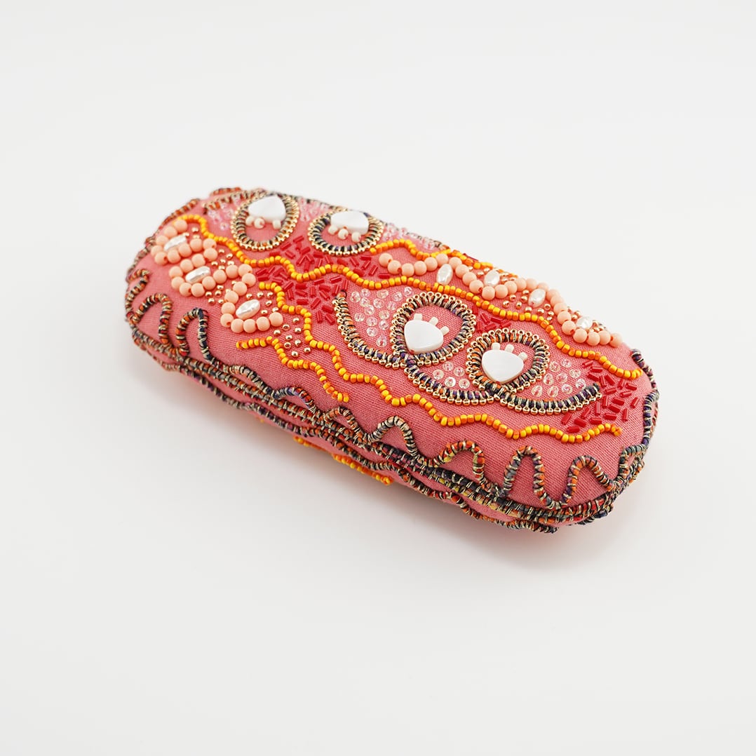 キルト芯を貼った生地に糸やビーズで細かな刺繍を施しました。