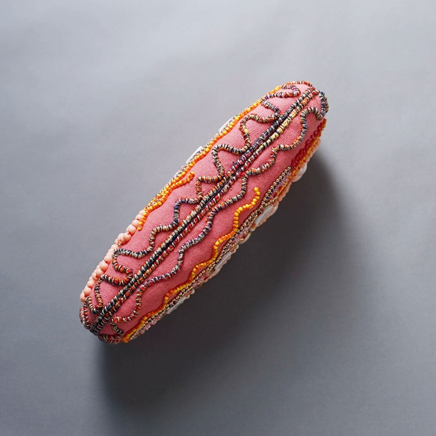 両面にびっしりと施されたビーズ刺繍は、ガーゼ生地にキルト芯を貼り、糸とビーズで繊細に描いたもの。 手に取るたび、刺繍の密度と立体感に心がときめきます。