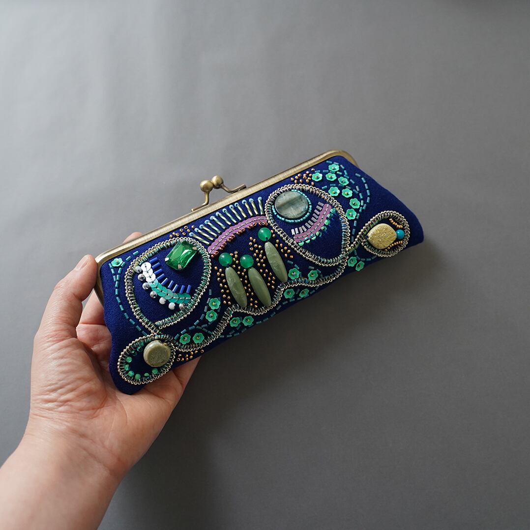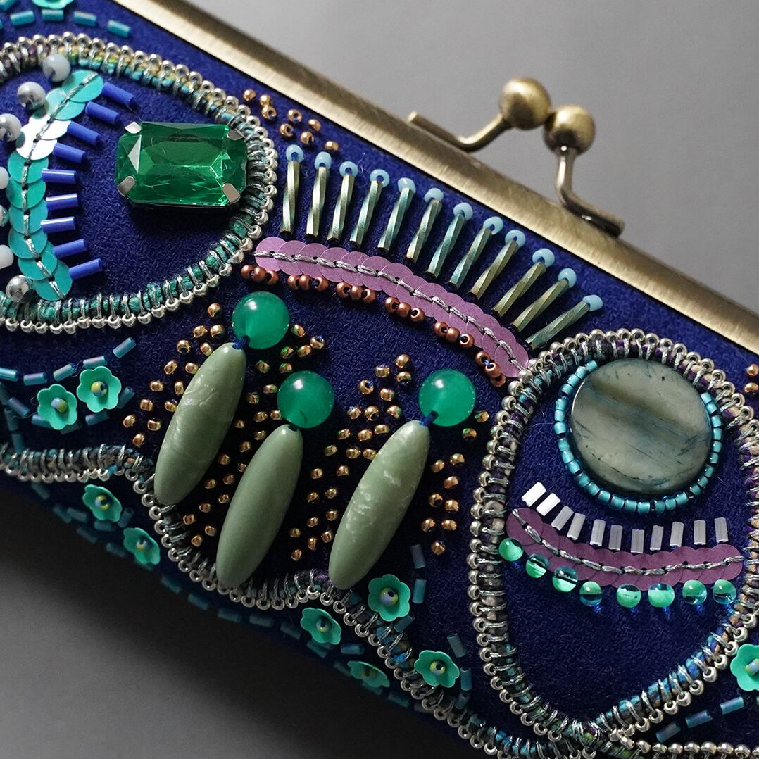 眼鏡ケースにも ビーズ刺繍のペンケースがま口 18 ブルー 一点もの 送料無料 クリスマス 母の日 ギフト