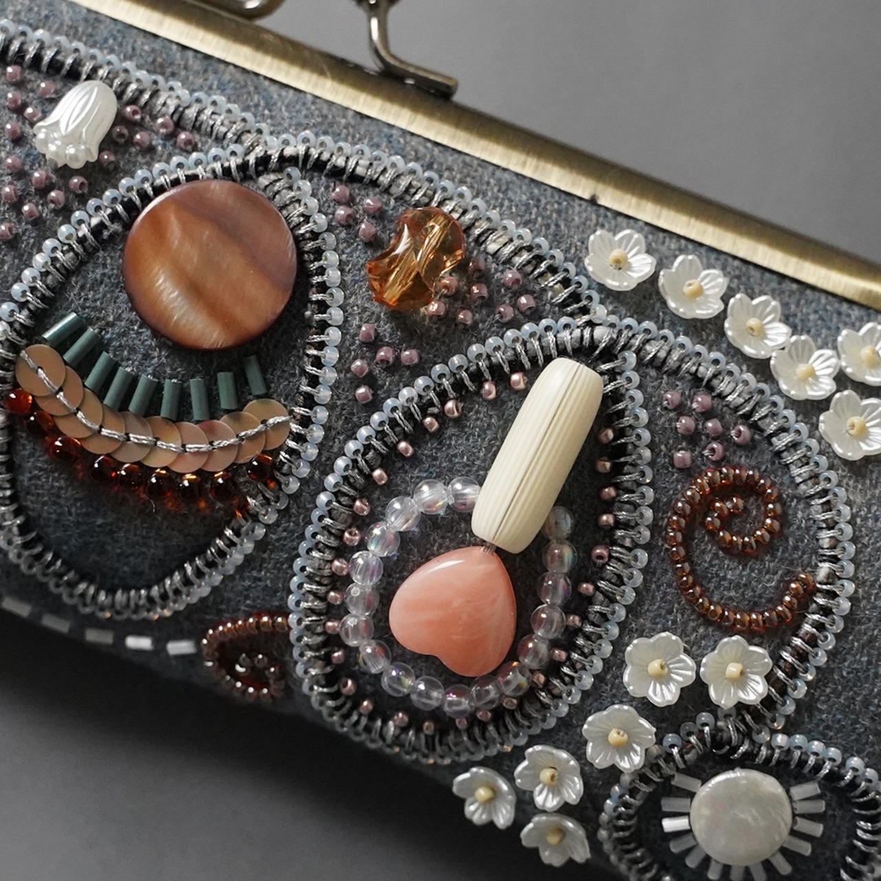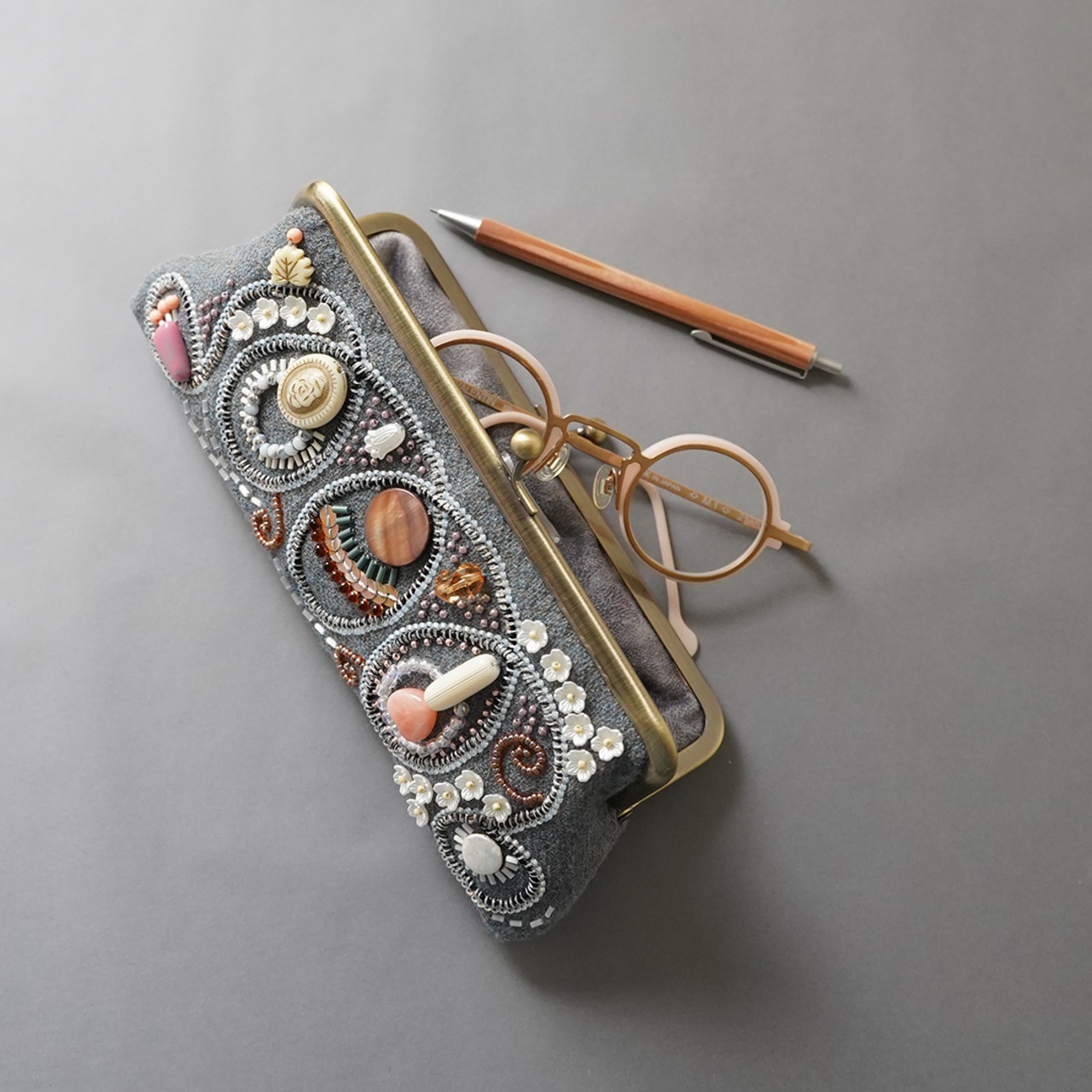 眼鏡ケースにも ビーズ刺繍のペンケースがま口 19 ブルーグレー 一点もの 送料無料 クリスマス 母の日 ギフト
