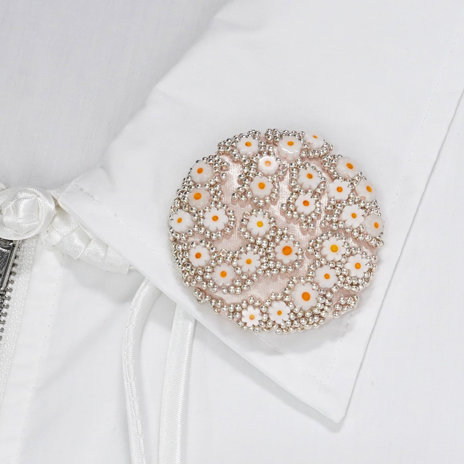シードビーズと花のビーズを用いて、隙間からサテンの生地がのぞくように刺繍しました。