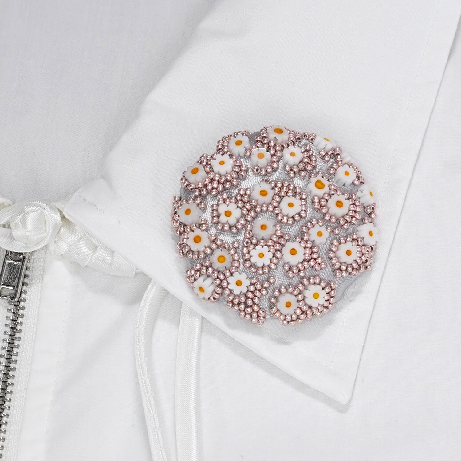 シードビーズと花のビーズを用いて、隙間からサテンの生地がのぞくように刺繍しました。
