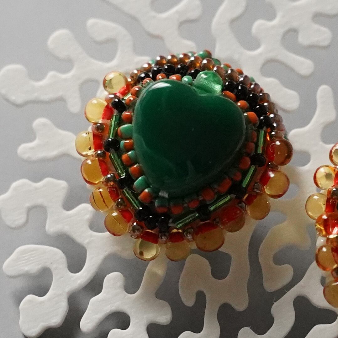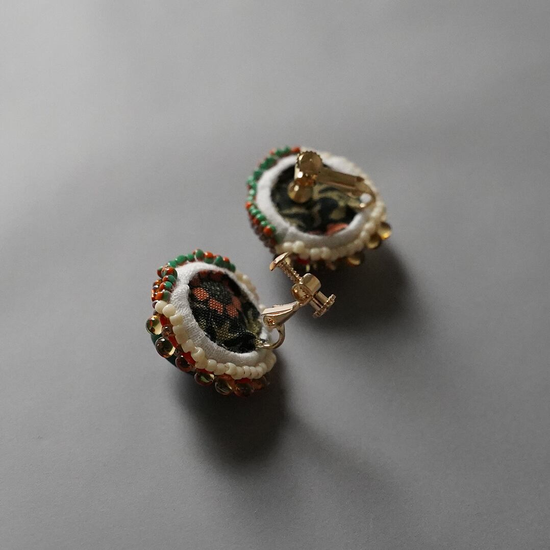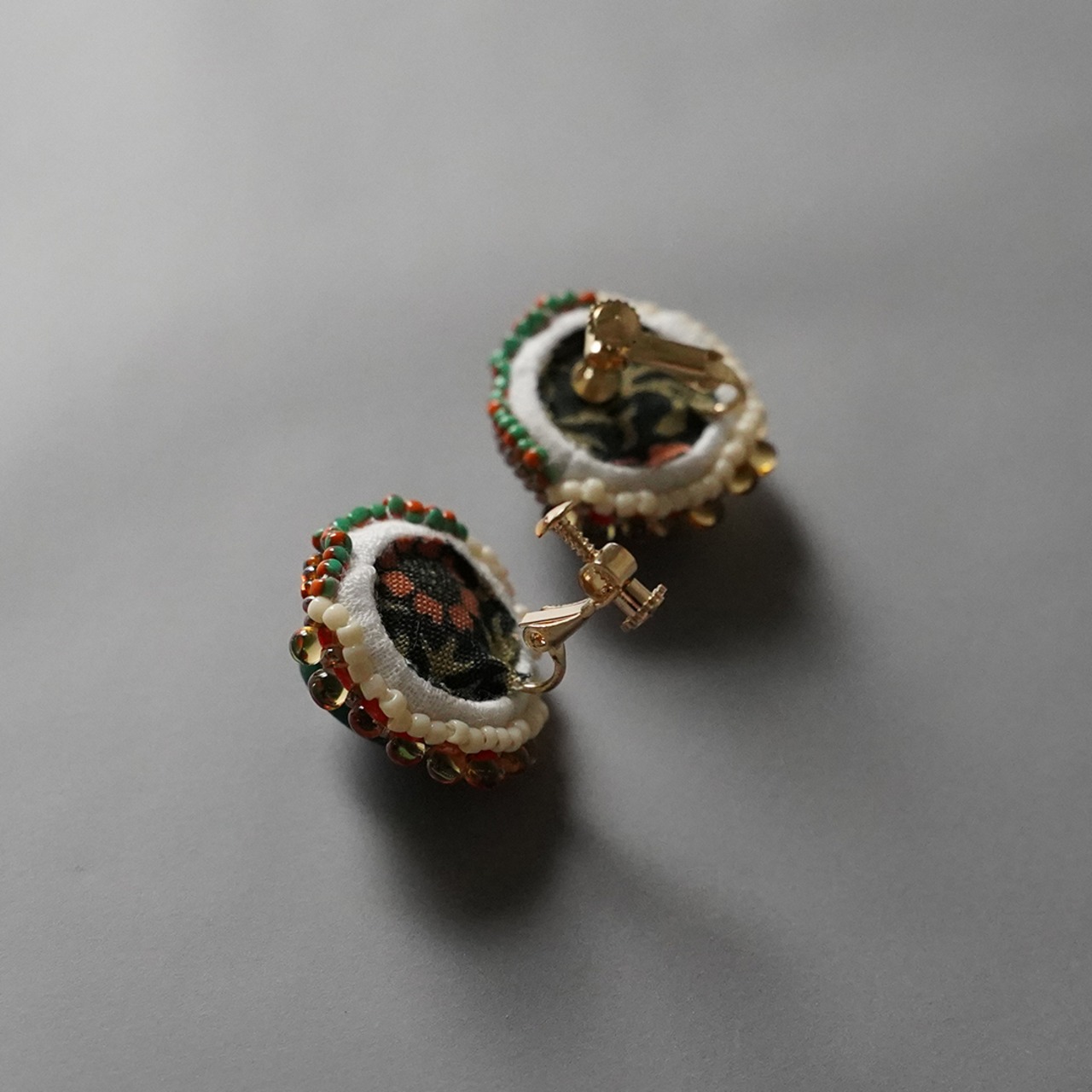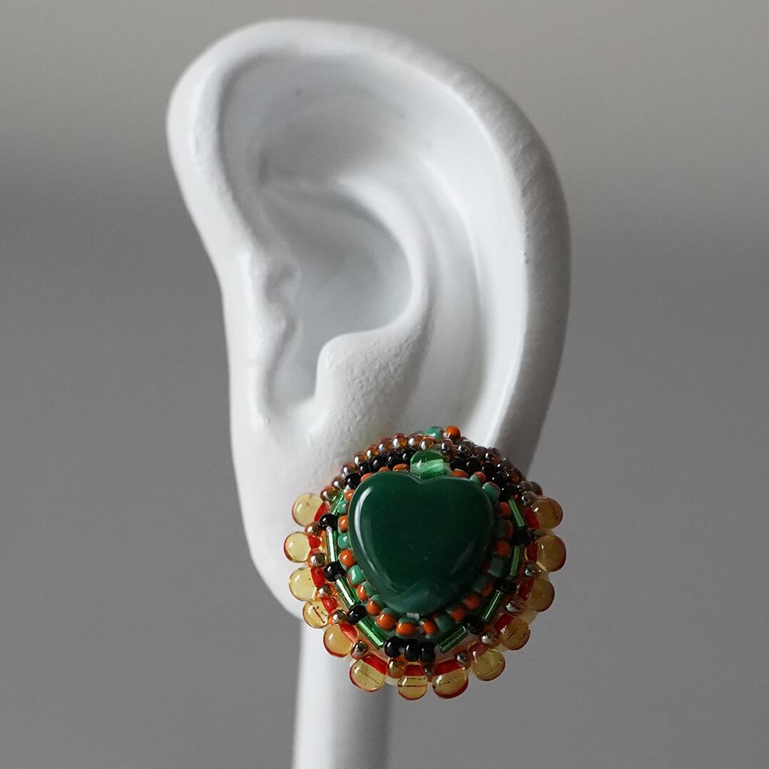 おしゃべりなイヤリング 6 まる ハート グリーン おおぶり ニッケルフリーイヤリング カラフル 一点もの ビーズ刺繍