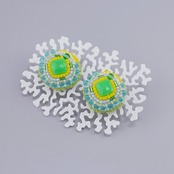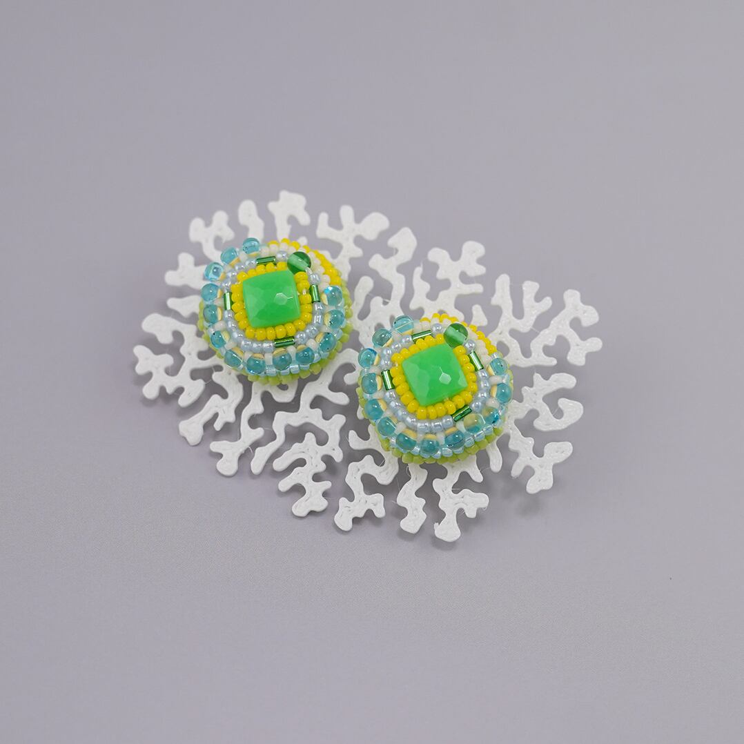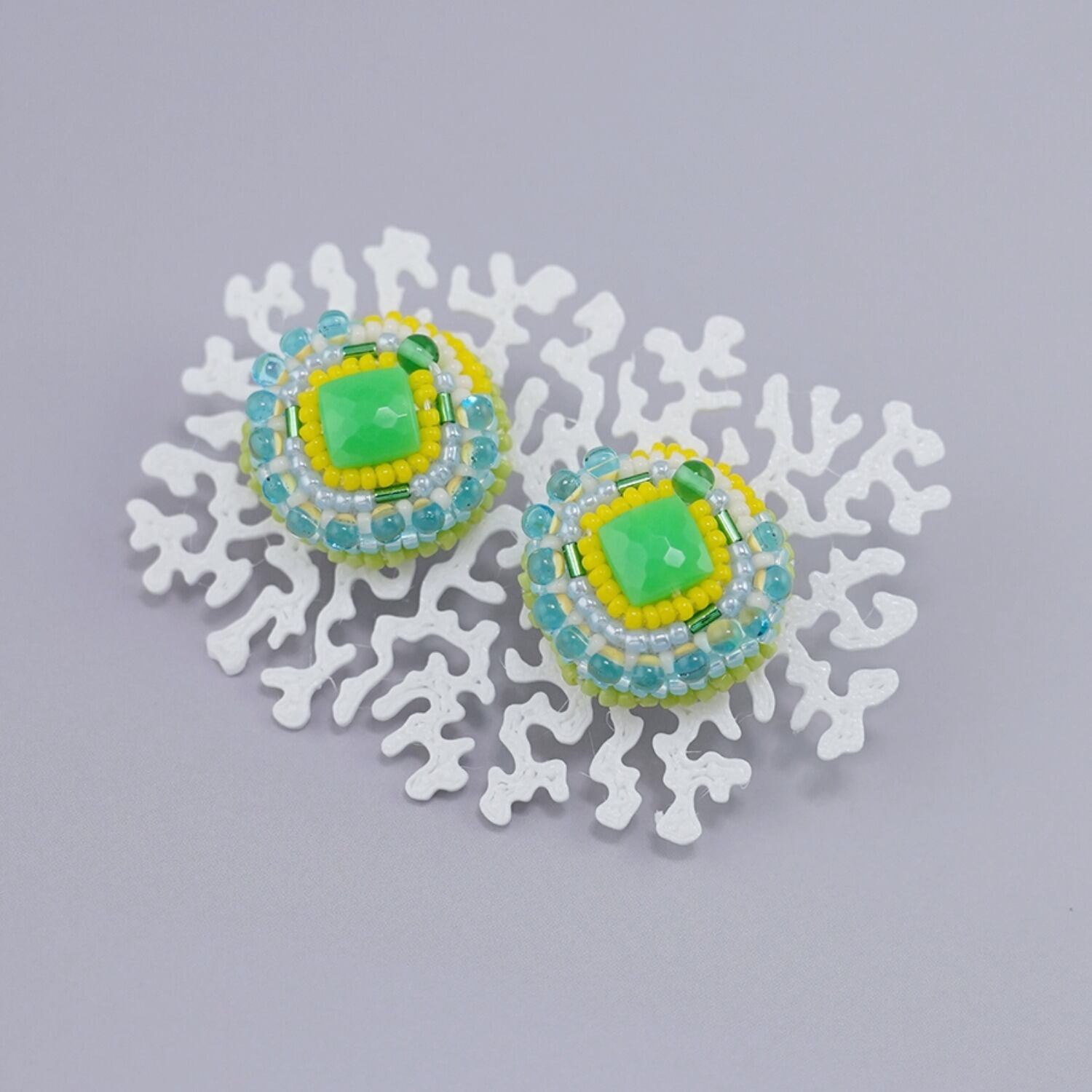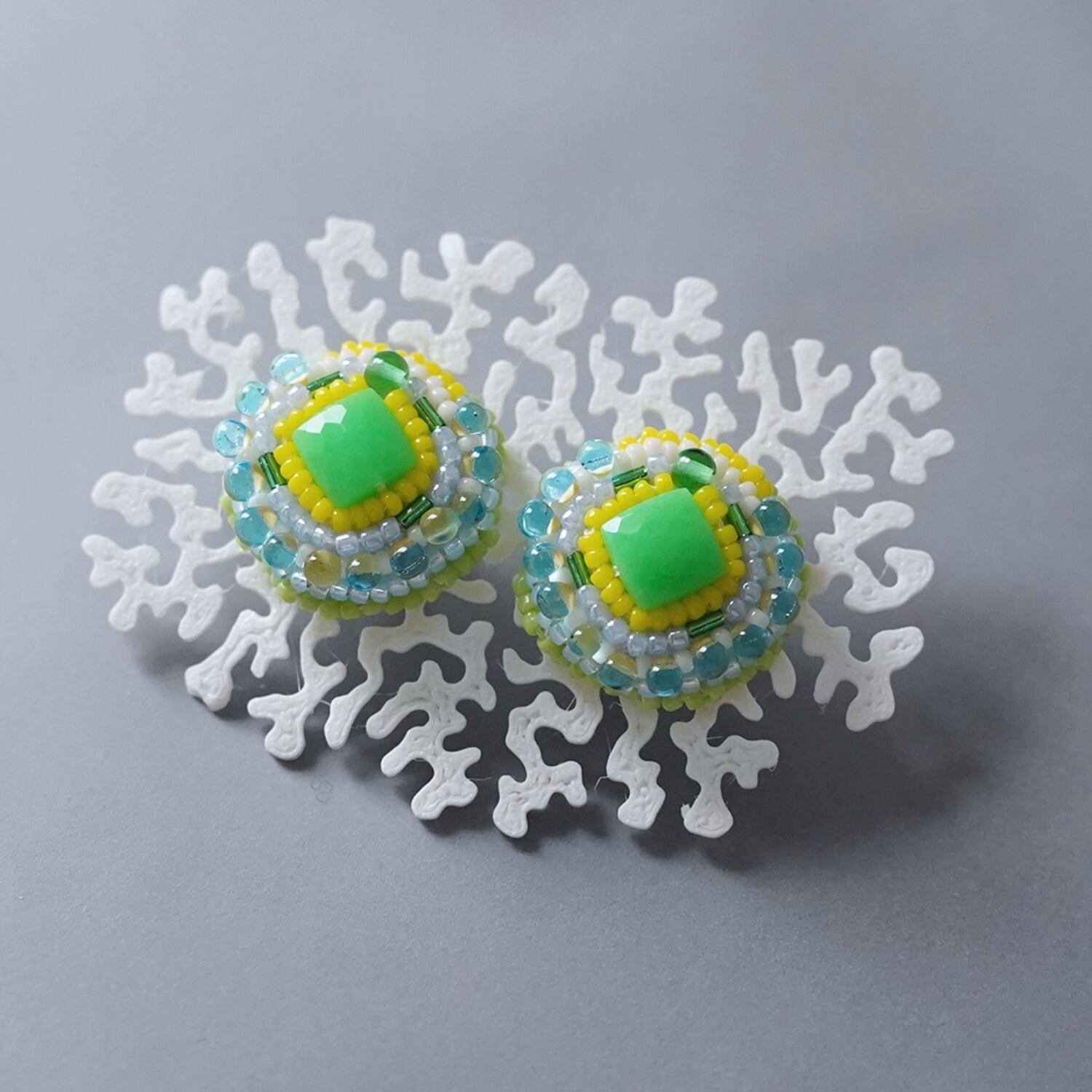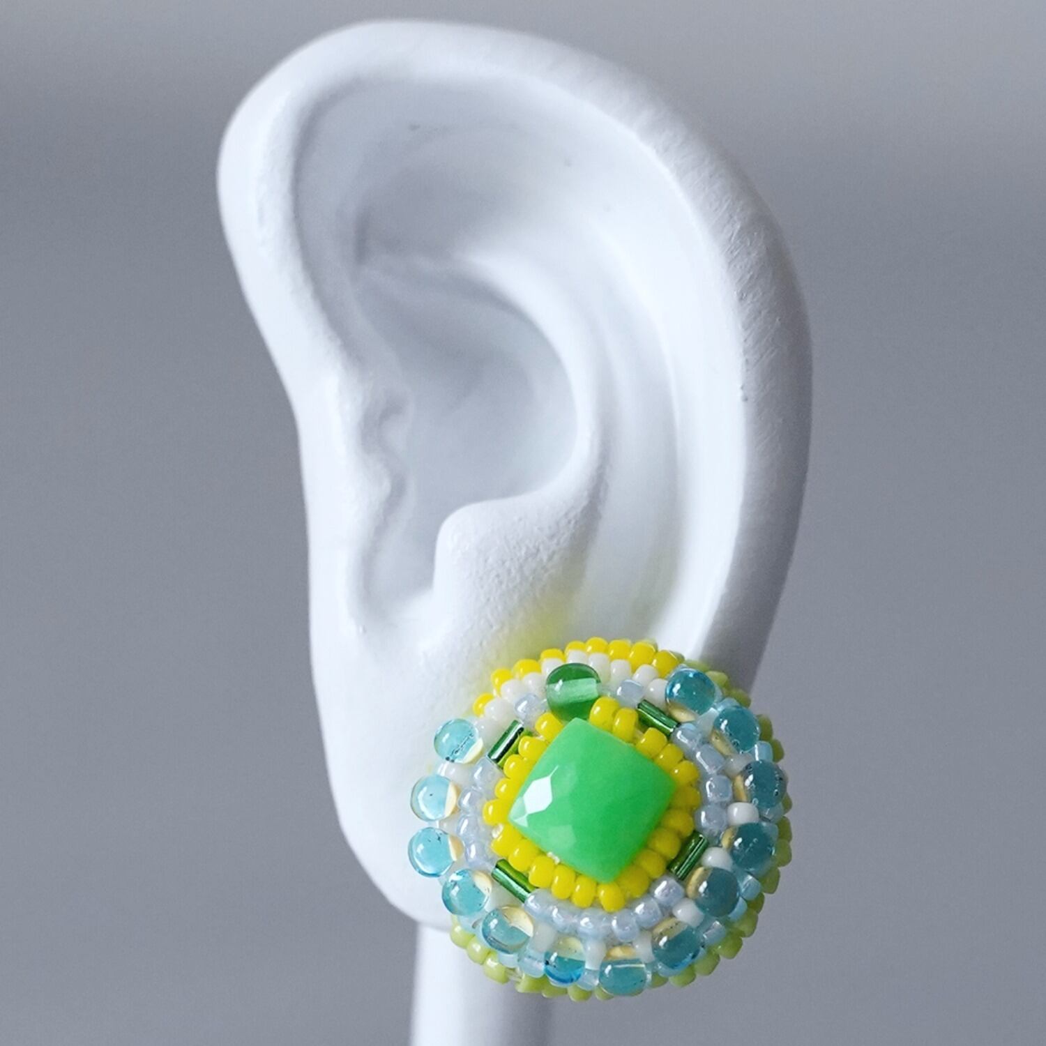 おしゃべりなイヤリング 9 まる グリーン おおぶり ニッケルフリーイヤリング カラフル 一点もの ビーズ刺繍