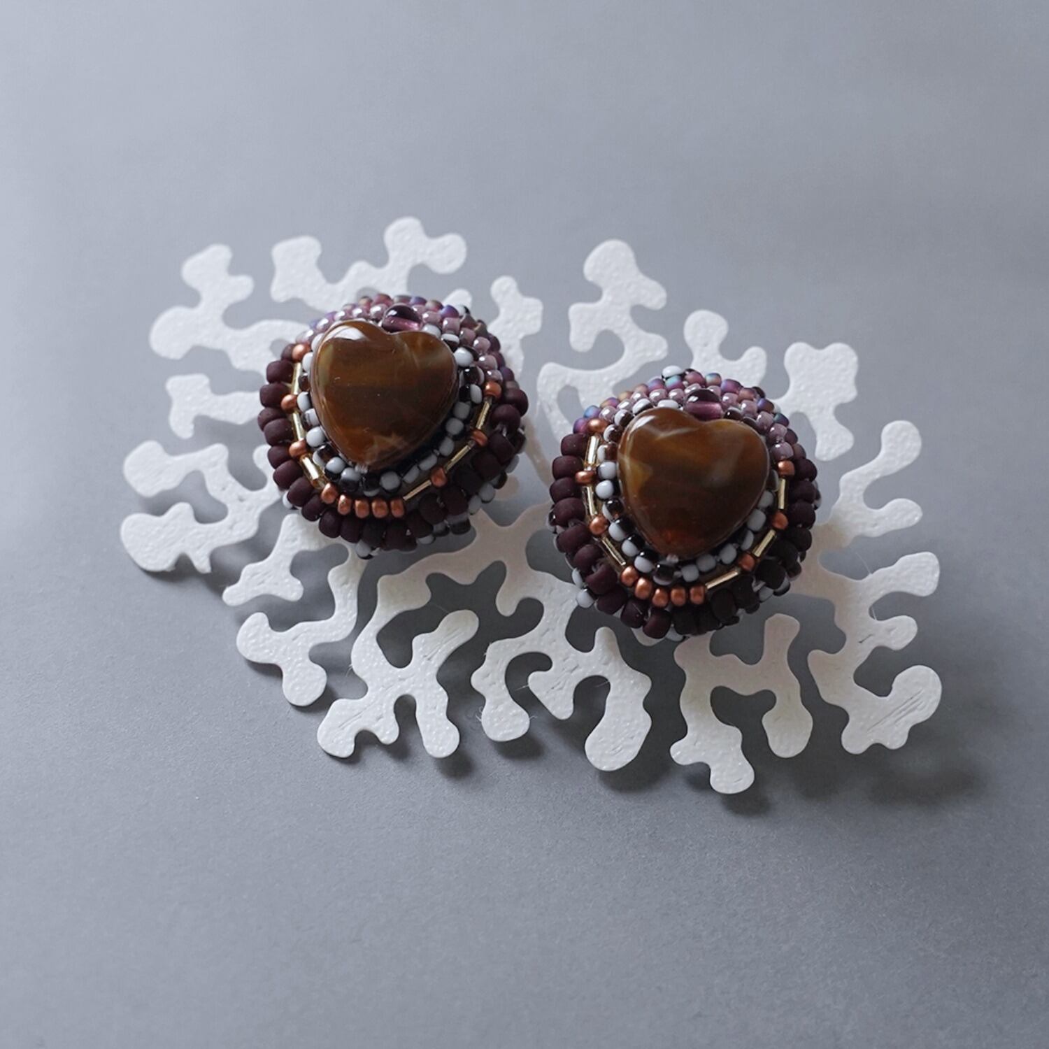 おしゃべりなイヤリング 10 まる ハート ブラウン おおぶり ニッケルフリーイヤリング カラフル 一点もの ビーズ刺繍