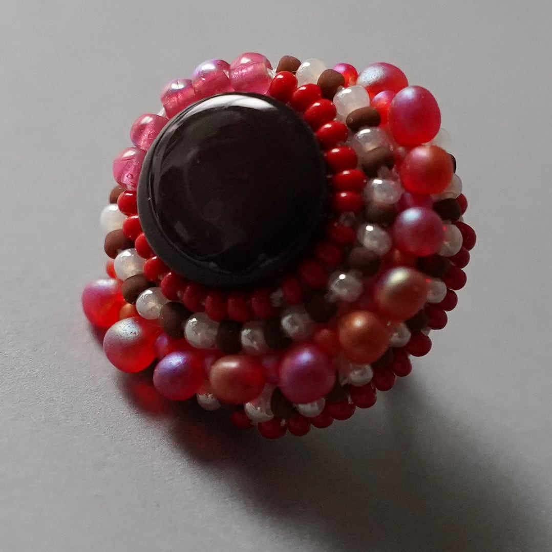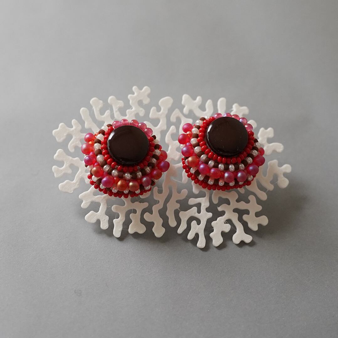 おしゃべりなイヤリング 12 まる ブラウン レッド ニッケルフリーイヤリング おおぶり 一点もの ビーズ刺繍