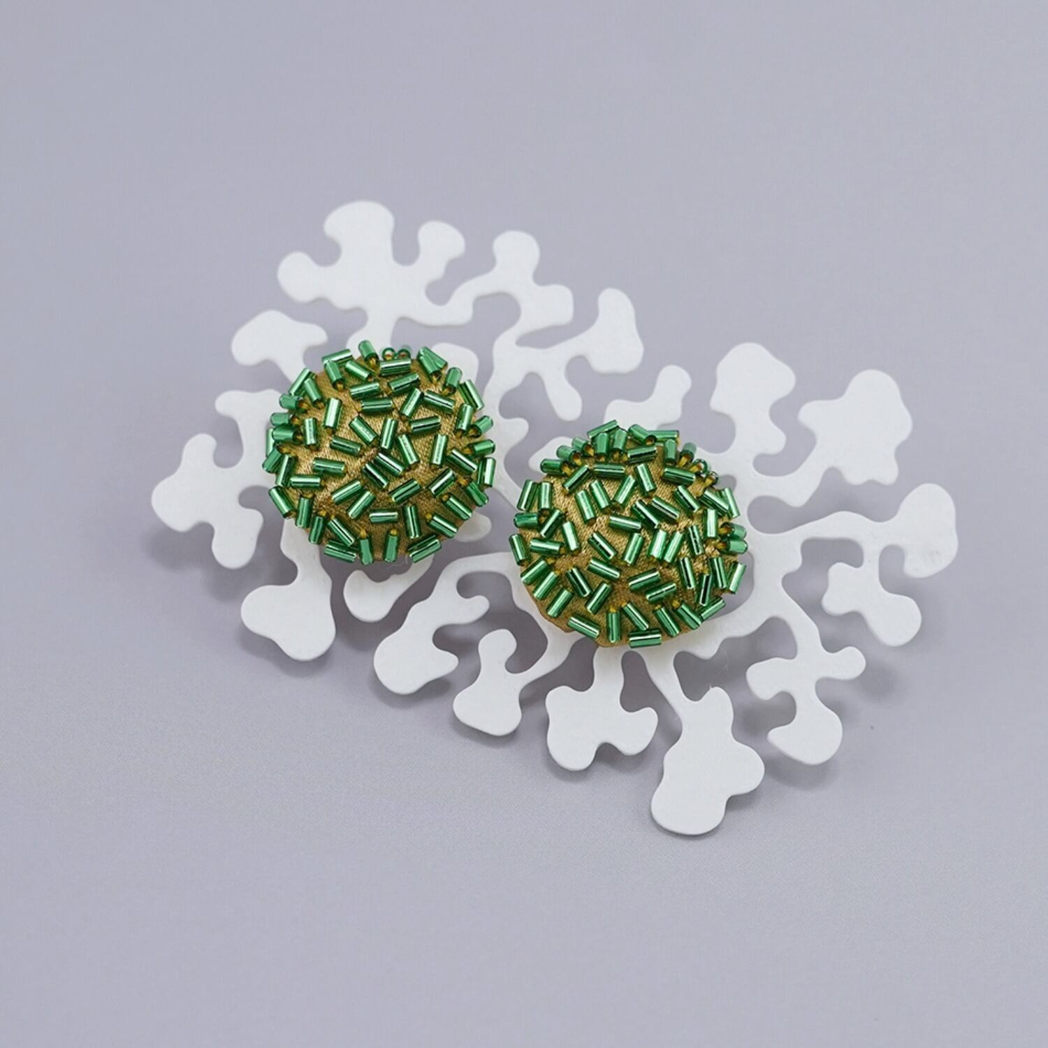 イヤリング ばらまく 2 まる 竹ビーズ グリーン イエロー ニッケルフリーイヤリング おおぶり 一点もの ビーズ刺繍