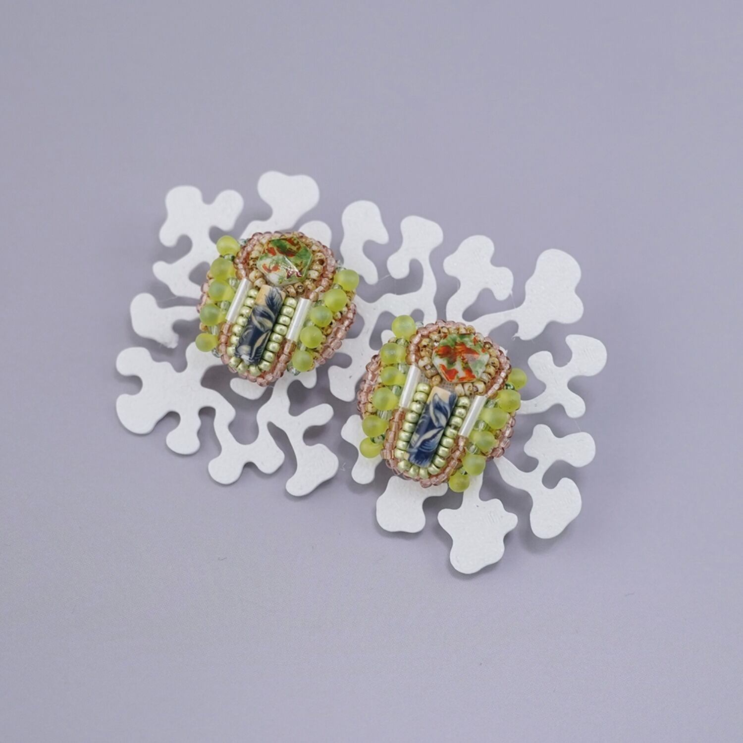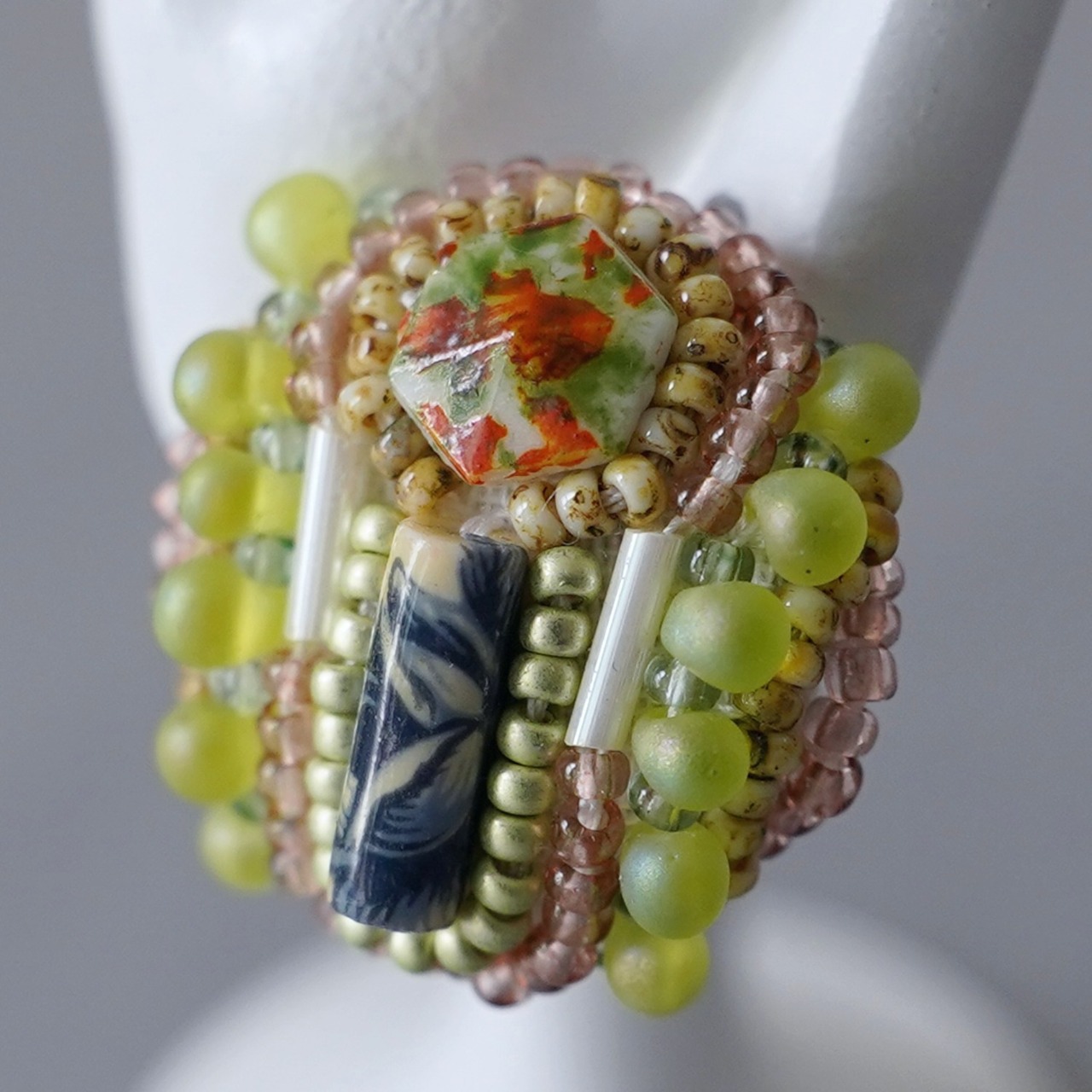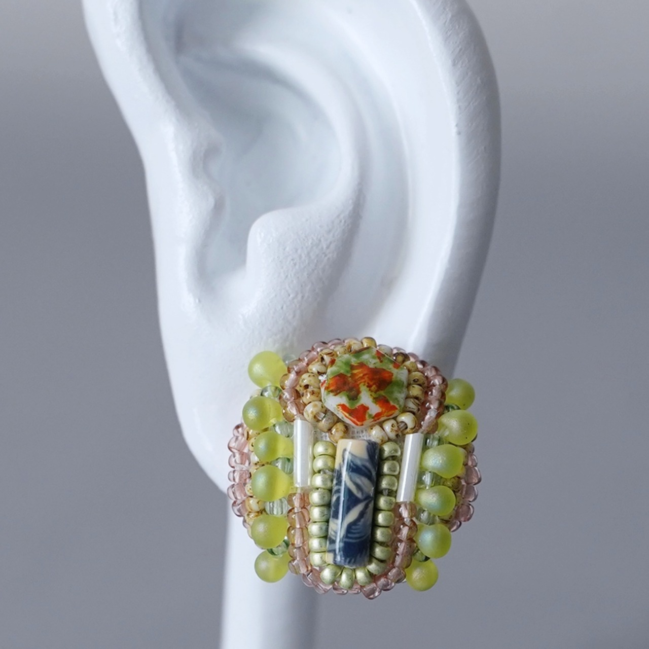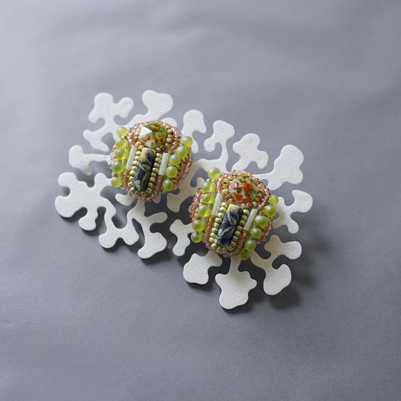 そのビーズを引き立てるように隙間なく刺繍をすると、カラフルでにぎやかで、まるでおしゃべりをしているように仕上がります。
