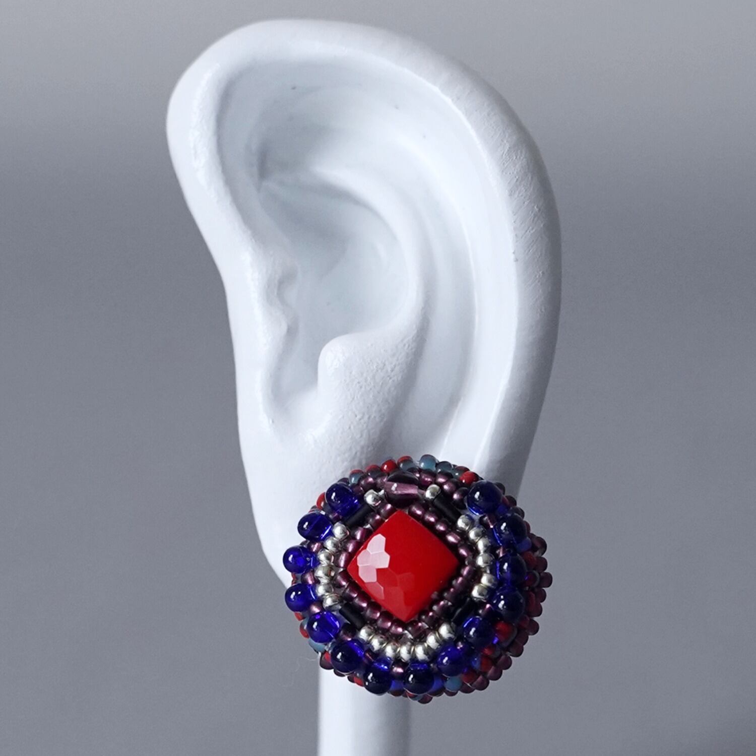 おしゃべりなピアス 8 まる スクエア レッド おおぶり サージカルステンレスピアス 一点もの ビーズ刺繍