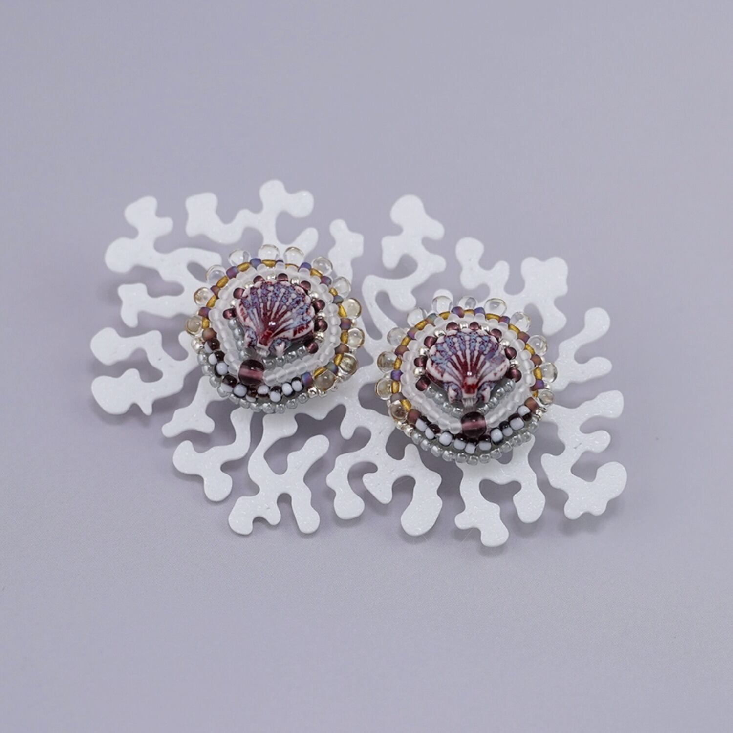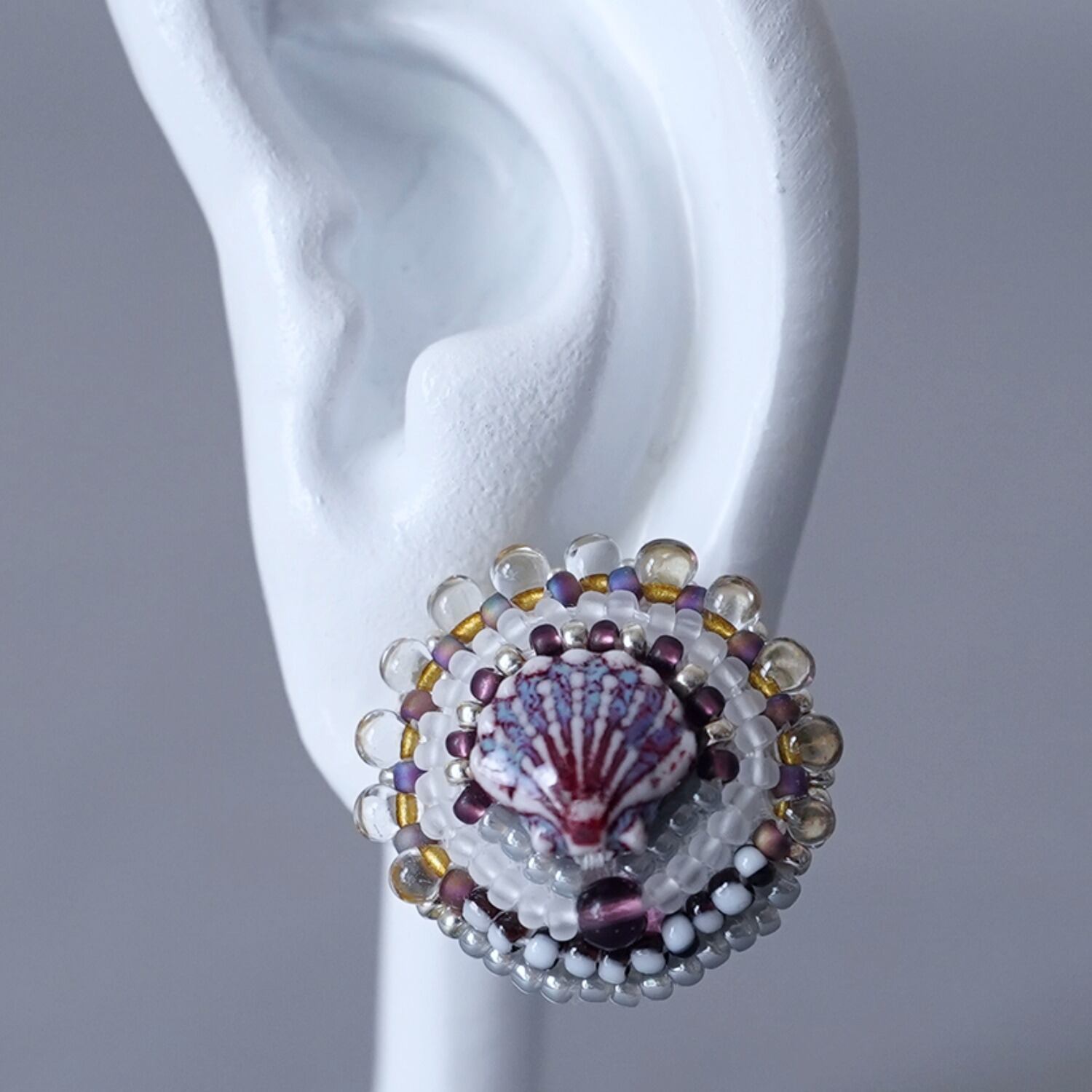 おしゃべりなピアス 10 まる シェル パープル おおぶり サージカルステンレスピアス 一点もの ビーズ刺繍