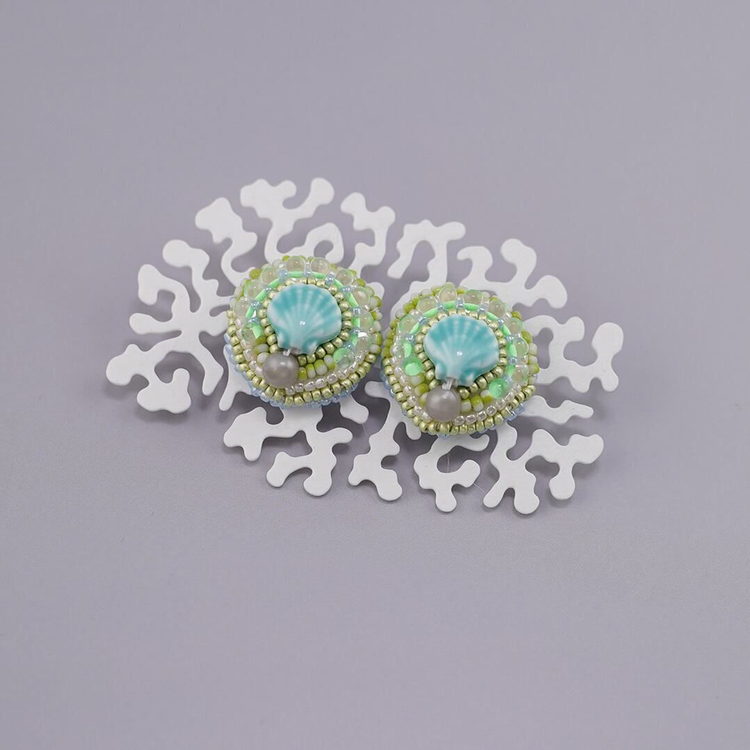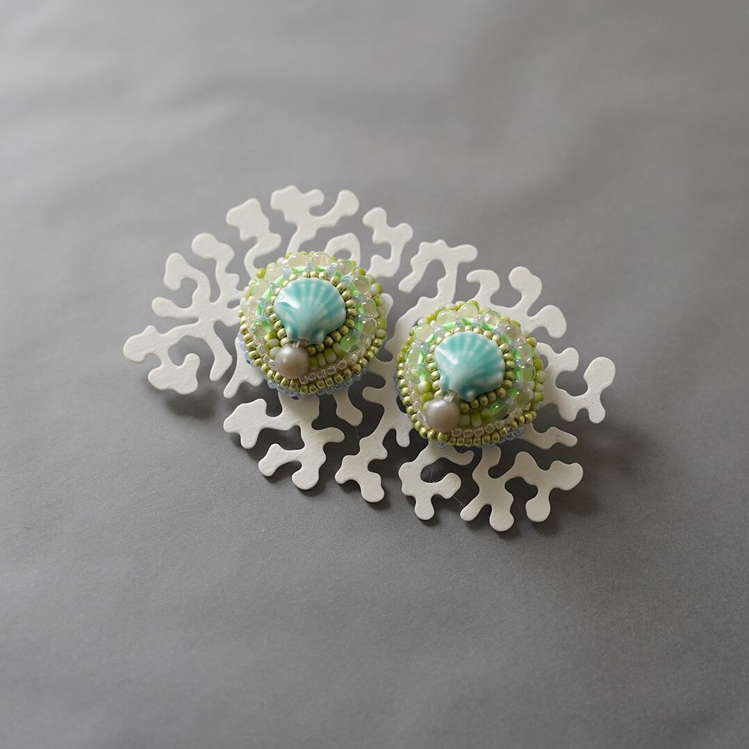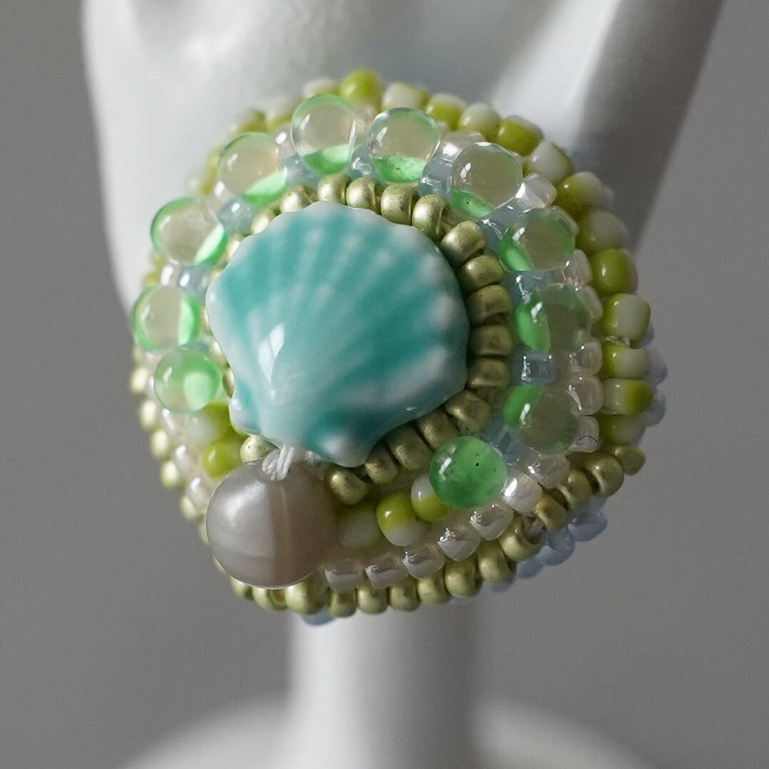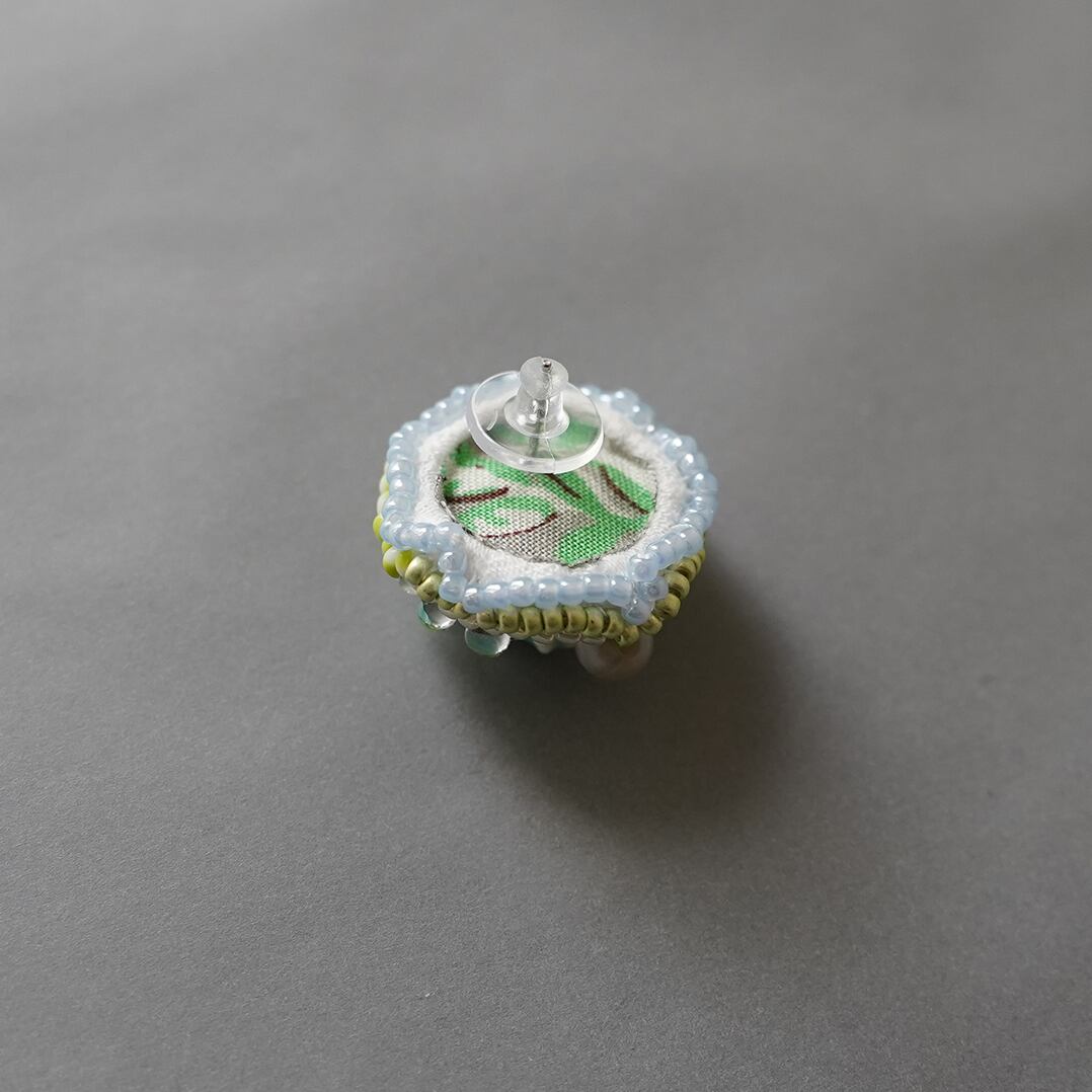 おしゃべりなピアス 12 グリーン シェル カラフル おおぶり サージカルステンレスピアス 一点もの ビーズ刺繍