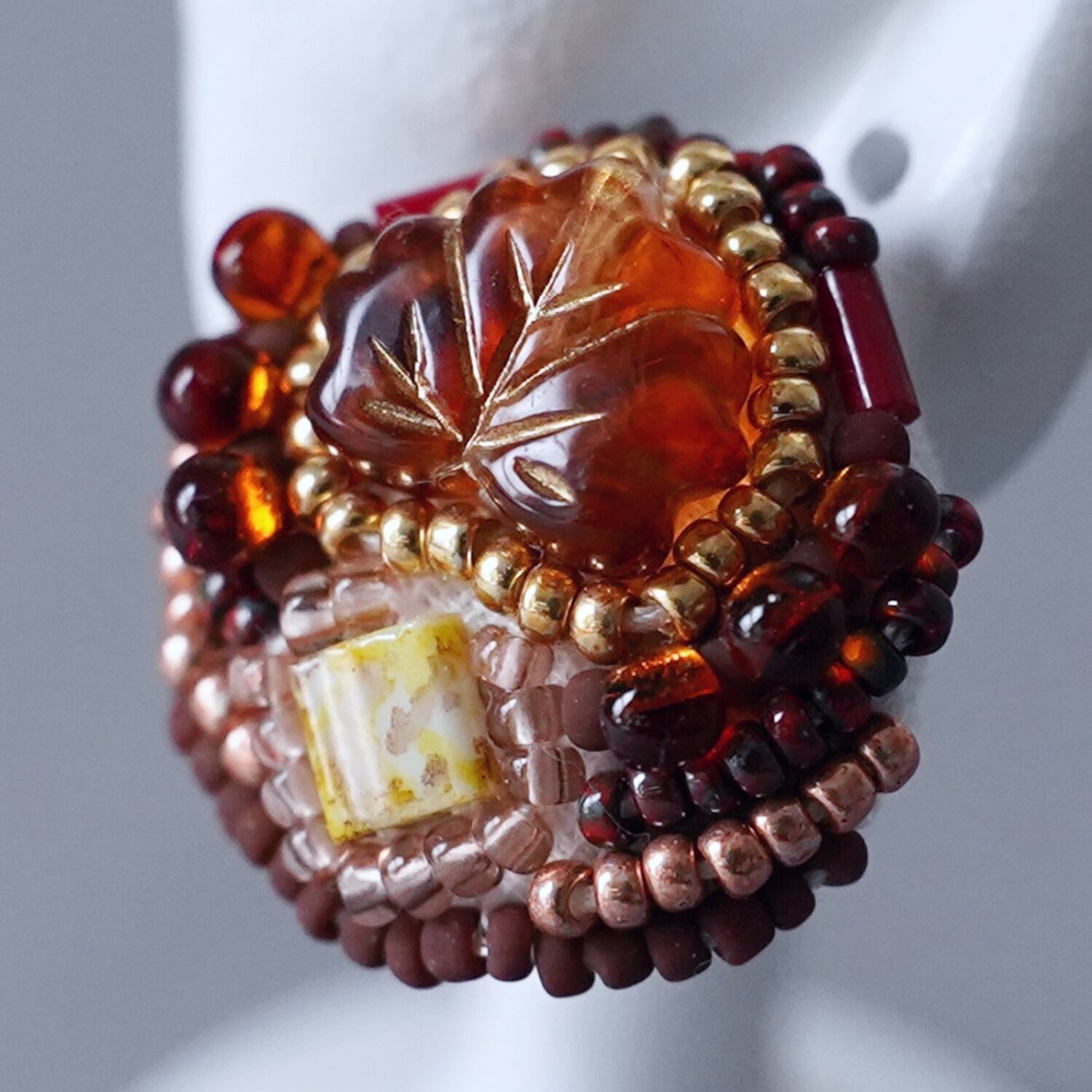 おしゃべりなピアス 15 まる ブラウン リーフ おおぶり サージカルステンレスピアス 一点もの ビーズ刺繍