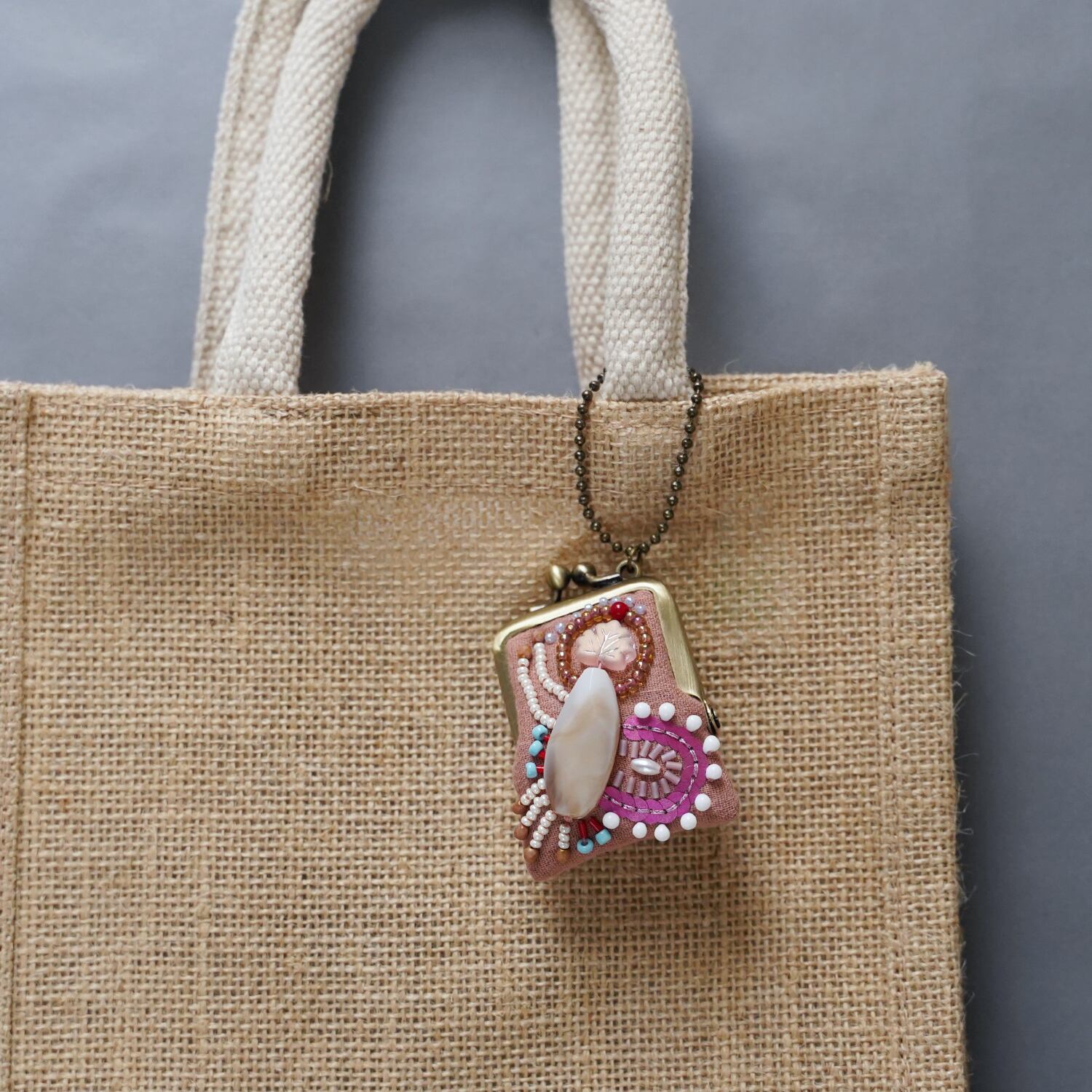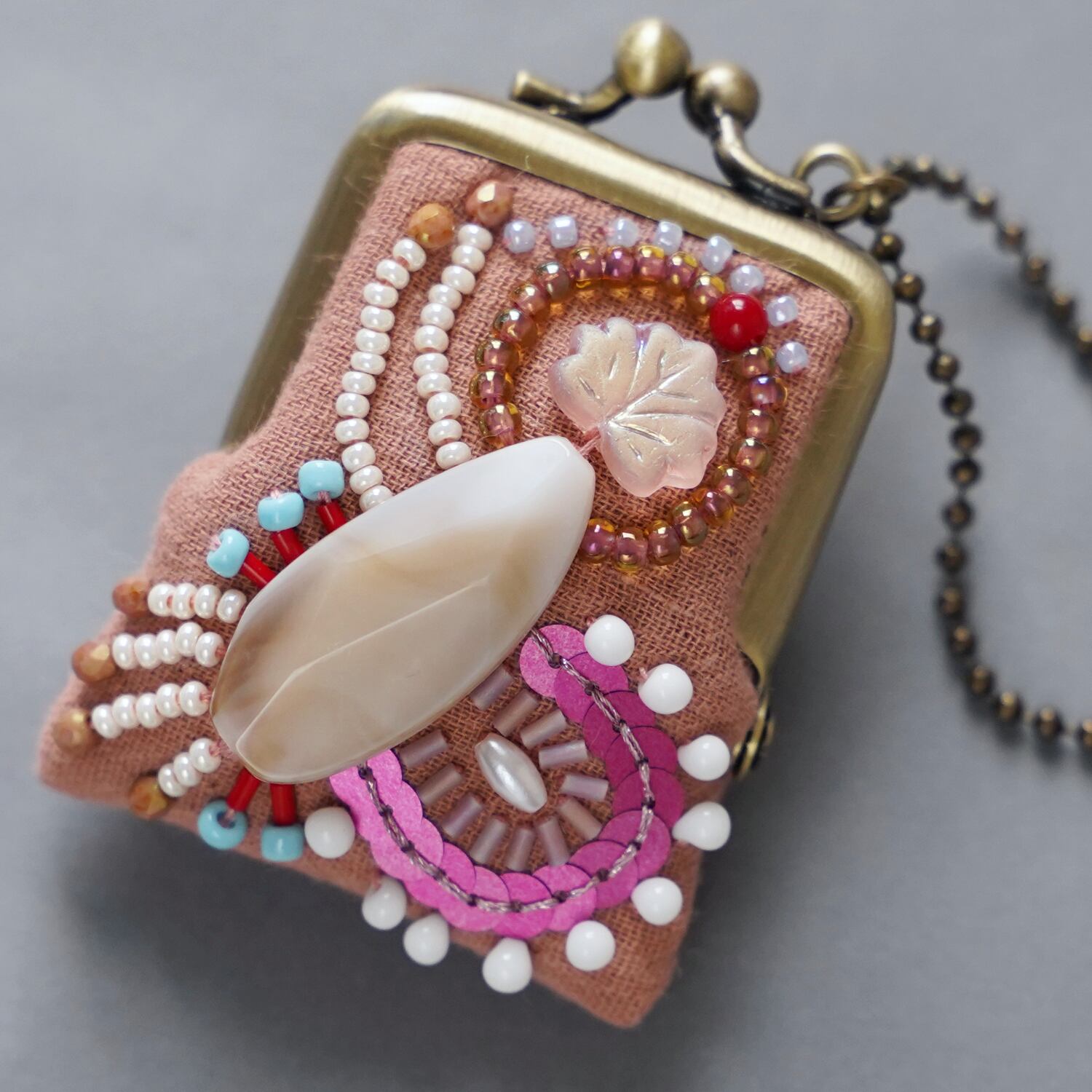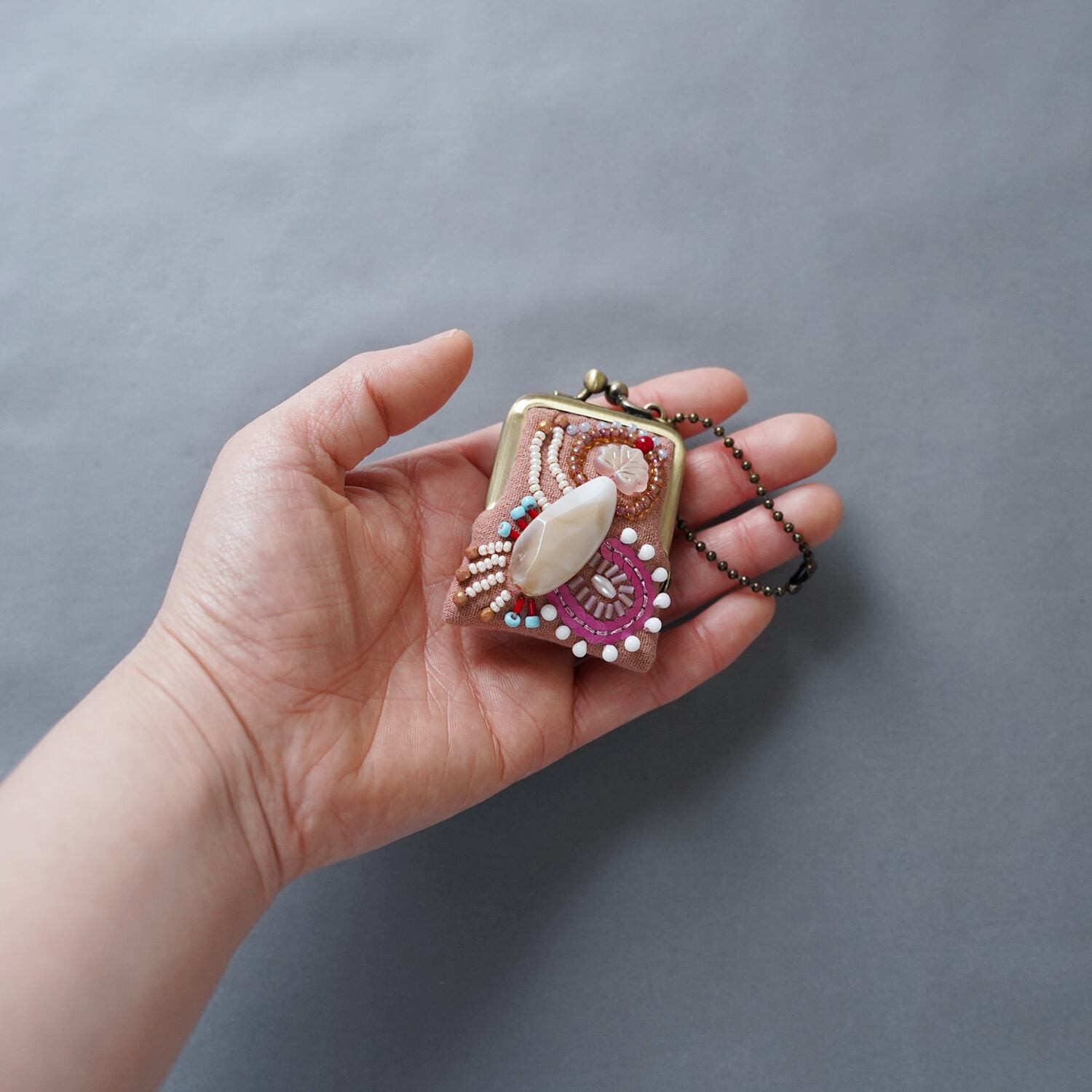 ネックレスにも、バッグチャームにも、小さな小さなビーズ刺繍のがま口 20 ピンク プレゼント アクセサリーケース