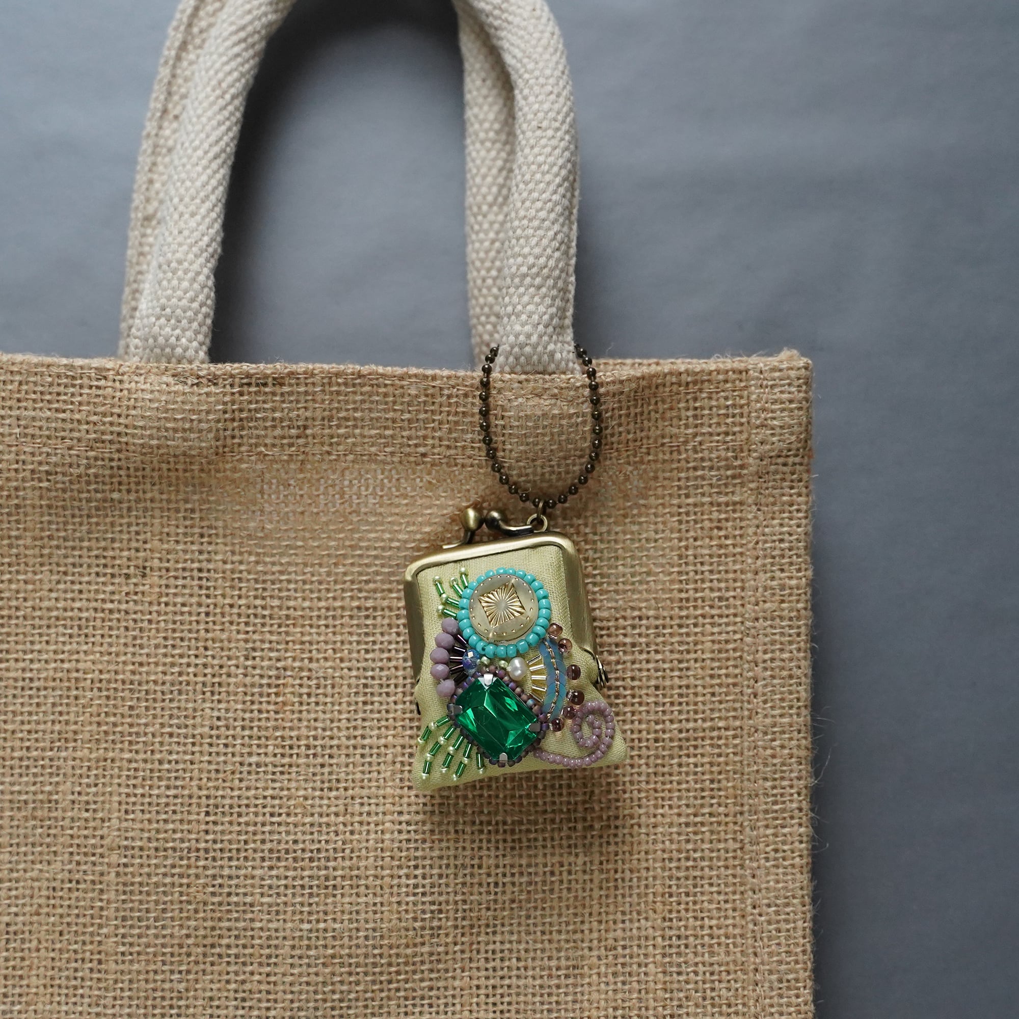 ネックレスにも、バッグチャームにも、小さな小さなビーズ刺繍のがま口 30 イエロー プレゼント アクセサリーケース